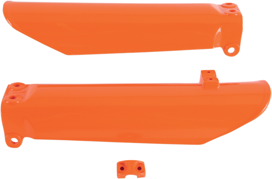 Fork Cover - Orange KTM Fork Tube Protectors Fork tube protectors are color matched to OEM or optional works colors Pre-drilled pieces mount easily to stock locations