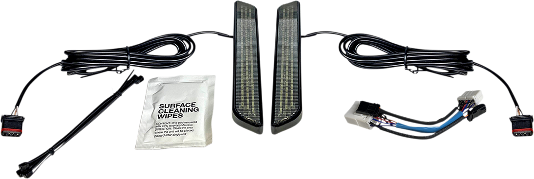 LED Fork Light - Smoke - Black LED Front Fork Lightz™ Replace the Harley-Davidson® OEM front fork reflectors on models with dual front brake calipers Super bright dual intensity amber LEDs, provide enhanced side visibility with run & turn functions to make you safer on the road Units are pre-taped to adhere in place of OEM reflector Plug and play wire harness for simple installation Fitment: