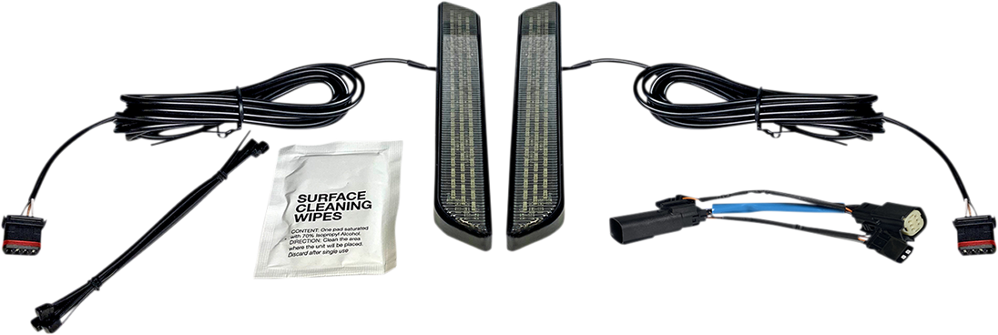 LED Fork Light - Smoke - Black LED Front Fork Lightz™ Replace the Harley-Davidson® OEM front fork reflectors on models with dual front brake calipers Super bright dual intensity amber LEDs, provide enhanced side visibility with run & turn functions to make you safer on the road Units are pre-taped to adhere in place of OEM reflector Plug and play wire harness for simple installation Fitment: