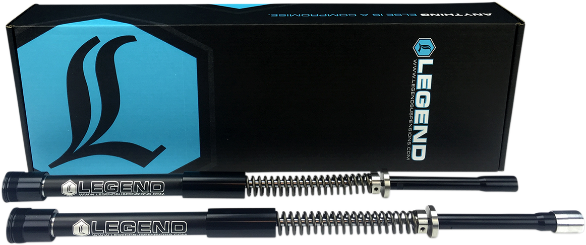 Standard AXEO Front Suspension - 49 mm - FLH '17+ Legend AXEO High-Performance Front Suspension System For FL Touring Models Designed to be used with stock diameter front wheels Easy installation Includes two mono-tube, dual chambered damper cartridges and two top out springs Performance spring rate Machined 303 Stainless threaded pre-load adjuster Increased pre-load range allows the tuning for various riding styles and weights Ride quality is smooth and controlled Improves stability, cornering and traction Eliminates front-end dive during aggressive braking and maneuvering Firm feel for high-speed sweeping turns Eliminates bottoming out on large bumps or potholes Reduces dragging floorboards and pegs Designed for optimum performance with Legend rear suspensions Lifetime Warranty Made by hand in Sturgis, SD USA P65 WARNING: Cancer and Reproductive Harm This product is NOT designed for use with 21" and 23" wheels Fitment: