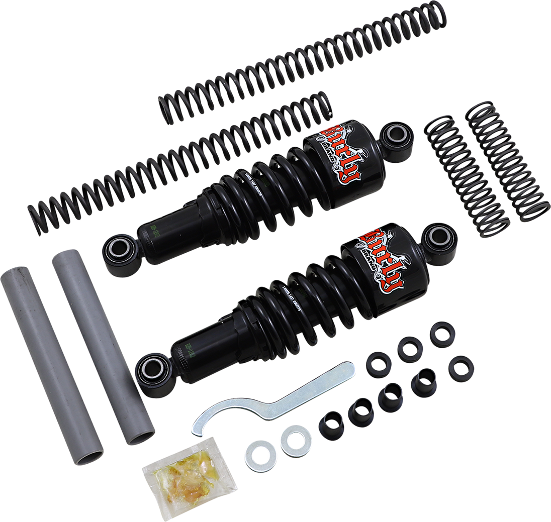 Suspension Kit - Slammer - Black - '04 - '15 XL Slammer Kit Complete lowering kit Easy-to-install fork springs that do not require the removal of forks (on most models) Drop-in fork springs lower front end up to 2” Shocks lower rear up to 2-1/2” Fitment: