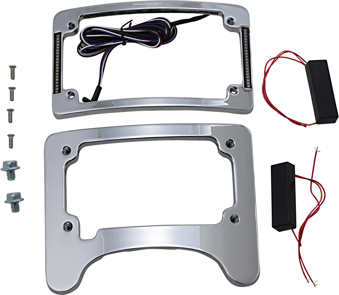 Turn Signal Eliminator/Illuminated Tri-Frame - Chrome Turn Signal Eliminator with Tri Radius Illuminated Plate Frame Light-weight aluminum radius license plate mount adds a custom look to the rear fender by eliminating the stock rear turn signal bar 6 white LEDs for plate illumination 20 red LEDs per side Utilizes stock bolt holes for mounting Mounting hardware included Hard- wire kit Fitment: