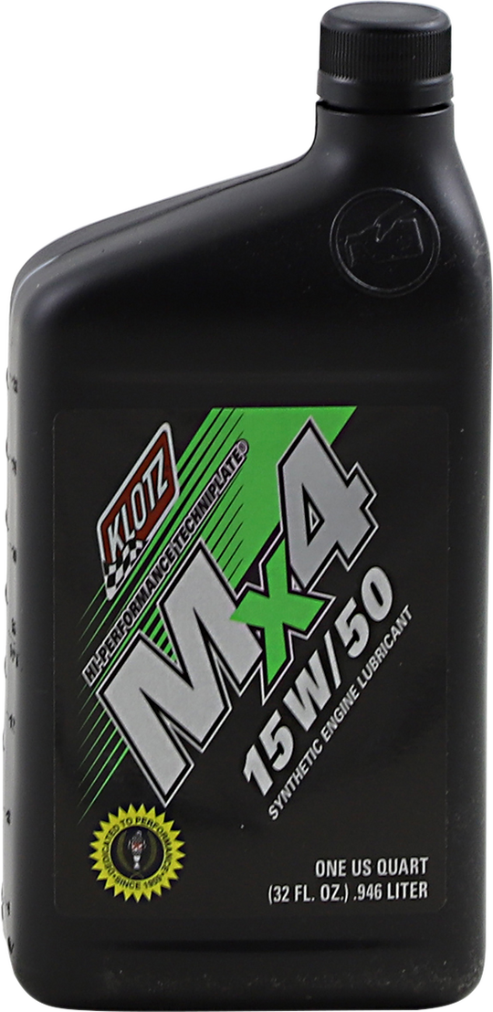 MX4 Synthetic Engine Oil - 15W-50 - 1 U.S. quart MX4 TechniPlate® Synthetic Engine Oil Designed specifically for off-road motorcycles and ATVs Protects against rust and corrosion Smoother clutch and transmission operation Prevents engine deposits Increases...Regular price $19.95 -