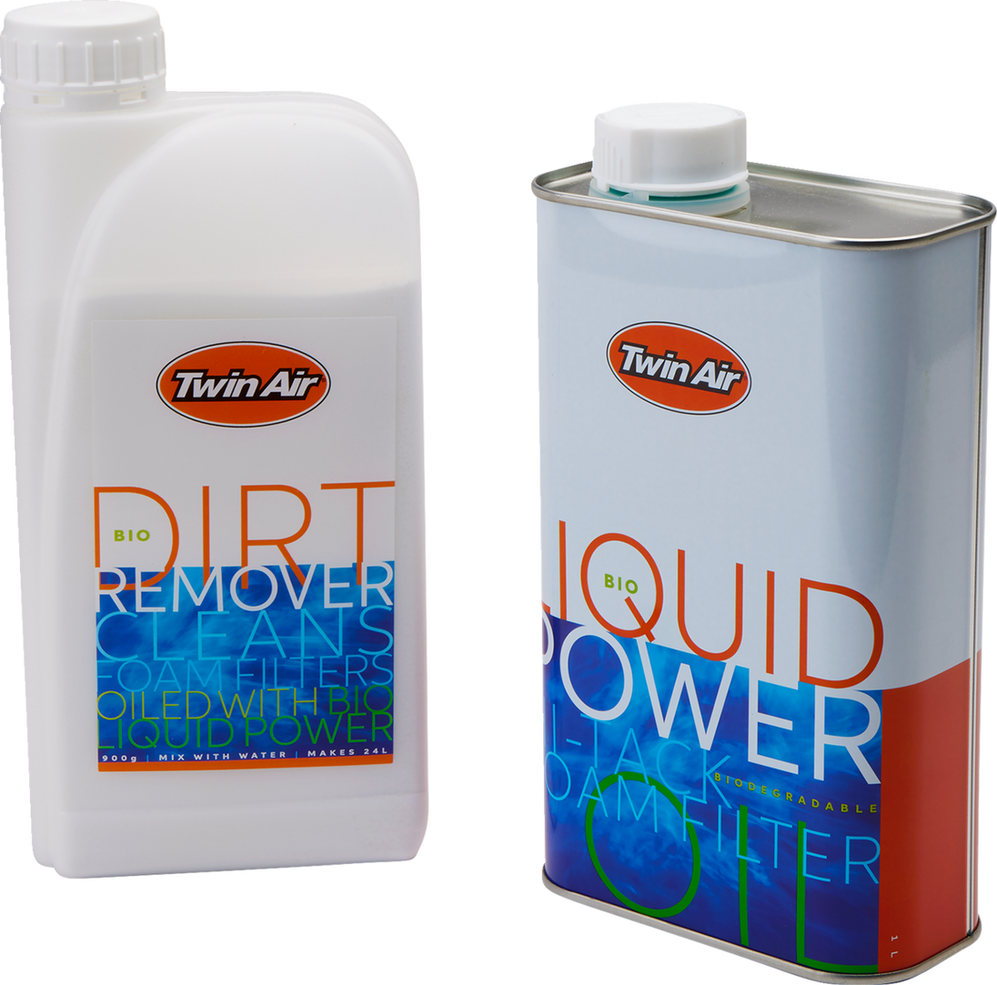 Biodegradable Air Filter Oil & Cleaner Kit Biodegradable Filter Care Keep your foam filter in like-new condition Kit contains one 800g bottle of BIO Dirt Remover, and one 1L can of BIO Power filter oil BIO Liquid Power filter oil was developed and produced by Texaco exclusively for Twin Air; exceeds the strictest standards on biodegradability by 16%; starts thin for deep, even penetration and dries to an even-coating, high-tack shield that traps dirt, dust and grit BIO Dirt Remover cleans Liquid Bio Power oil by using granular detergents instead of solvents; water-soluble cleaner can go right down the drain without clogging the drain or harming the environment; will not harden or damage filter foam Recommended for all foam filters