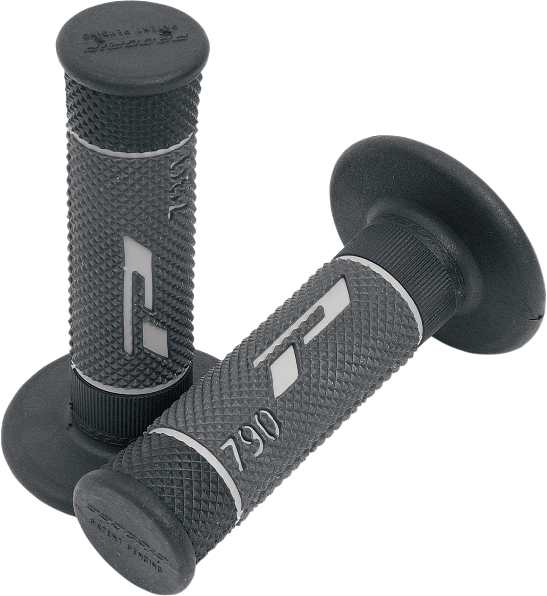 Grips - 790 - Black/Black 790 Triple Density Grips Off-road grip with ProGrip™ triple-density technology Following the success of the 790, a new slim profile in proprietary ProGrip™ compound in three densities Hard density against the bar to decrease twisting and movement on the bar; medium and soft density in the grip and palm area for added comfort and reduced vibration For 7/8" bars and twist throttles 115mm L