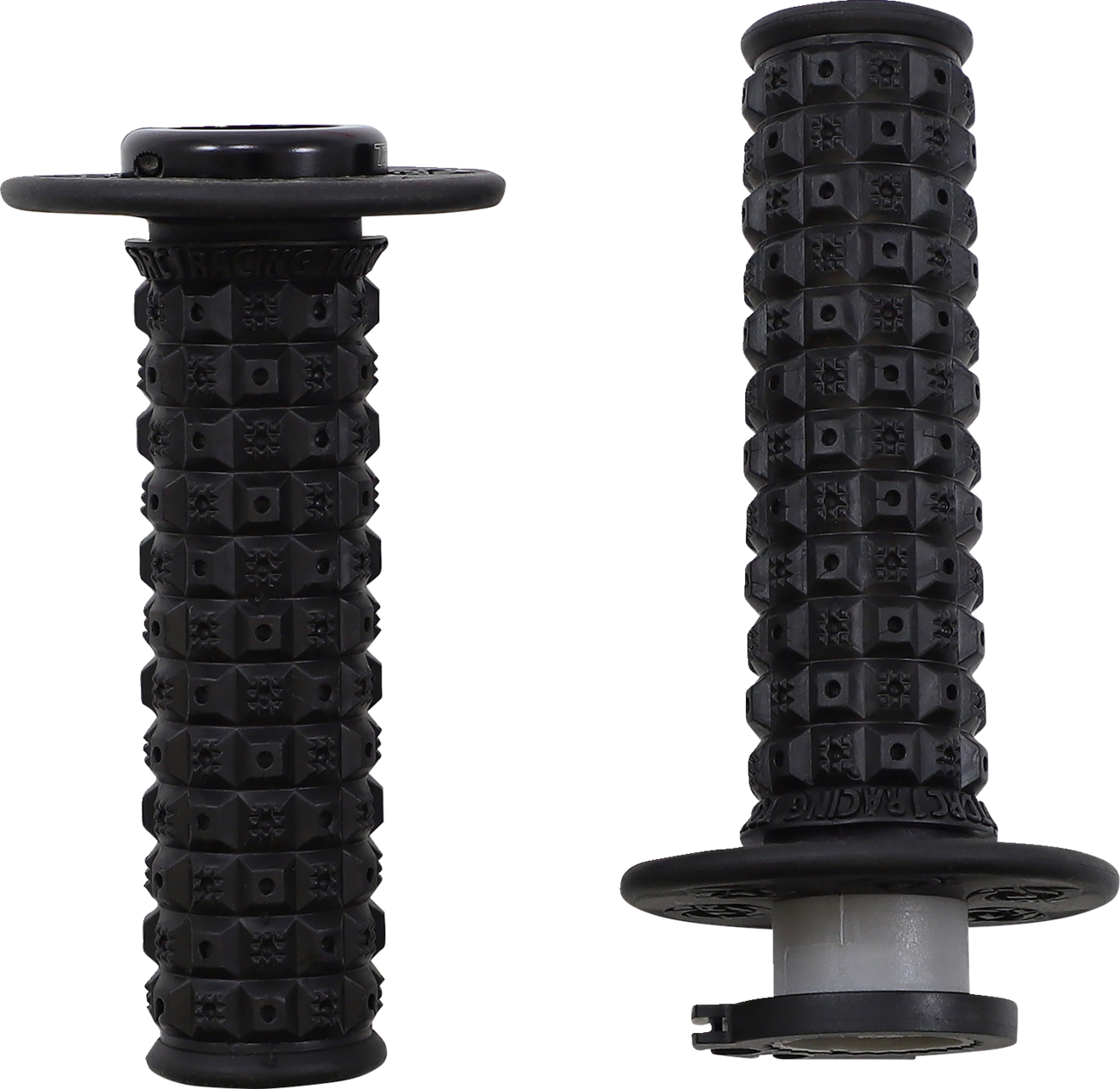 Grips - Defy - Lock-On - KEV-TEC Ballistic Rubber - Black Defy Lock On Grips 100% slip free performance guaranteed Simple installation without waiting for glue to dry OEM spec throttle tube included with 22 point adjustment to put the waffle pattern right where you need it Snap-on multi adjust throttle cams included in each 4-stroke or 2-stroke bike kit No need to purchase any throttle cams separately CNC-machined aluminum locking collar with Torx T15 stainless bolt helps resist stripping and corrosion Race tested diameter with a soft, tacky compound provides the ultimate in feel and control Tapered waffle pattern helps contour to your hand and provides thumb relief Grip donut groove helps keep grip donut flat and in place if needed Knockout ends easily to accommodate wrap-around handguards Mini bike cams for 50cc, 65cc, 85cc, and KLX110 models sold separately.