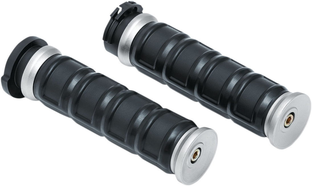 Grips - Dillinger - Dual Cable - Silver Dillinger Handlebar Grips Dillinger Grips combine a narrow profile with ribbed EPDM rubber for aggressive grip, commanding control and a soft, vibration-dampening foundation to combat hand and forearm fatigue Durable ribbed EPDM rubber provides comfortable grip, vibration dampening, and will not hard, crack or wear over time Features aluminum collars and removable end caps for use/installation of bar-end mirrors, turn signals or weights