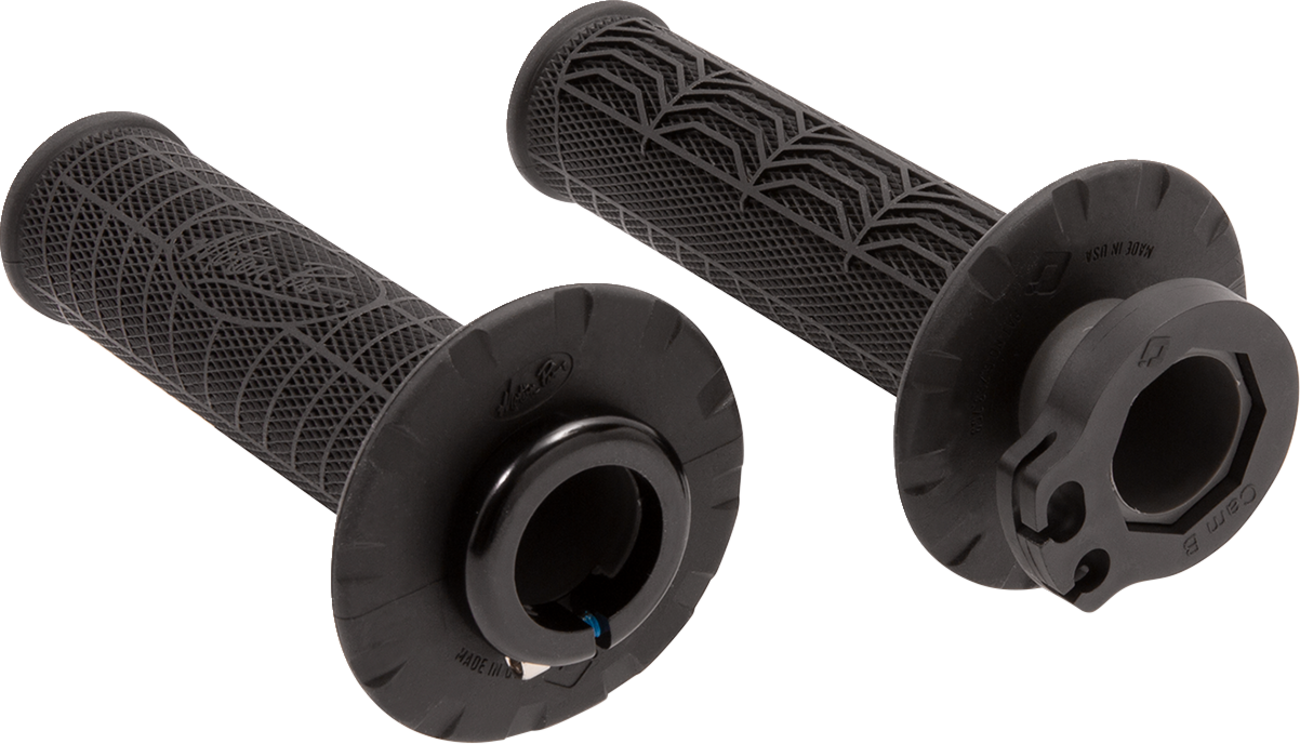 Grips - DirtControl™ V2 - Black DirtControl™ V2 Grips V2 lock-on system provides slip-free performance Easy installation and removal that doesn’t require glue – No more waiting for glue to dry! Throttle tube features a unique snap on cam system that allows one throttle tube to work with many models and brands Medium density compound grip Motion Pro web pattern and fingertip traction with light knurling Kit includes cams for both 2 & 4-stroke applications Secure feel in both wet and dry conditions Outlasts conventional grips due to no need for safety wire Knockout ends can easily be removed for installing handguards Optional cams included: A, B, C, D, J & M Additional cam reels are available Unique grip pattern designed by Motion Pro Made for Motion Pro in U.S.A. by ODI