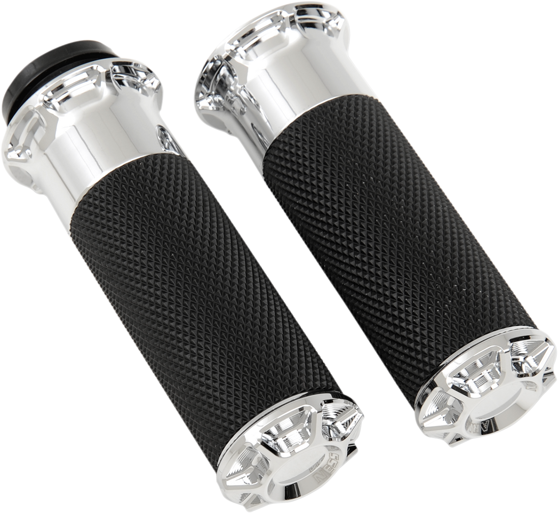 Grips - Beveled - TBW - Chrome Fusion Beveled Grips Each grip design features excellent traction for your hands Billet aluminum accents are intricately machined All grips come with throttle sleeve installed and include grip glue and simple to follow instructions Matching footpegs and shifter pegs are available separately Fitment: