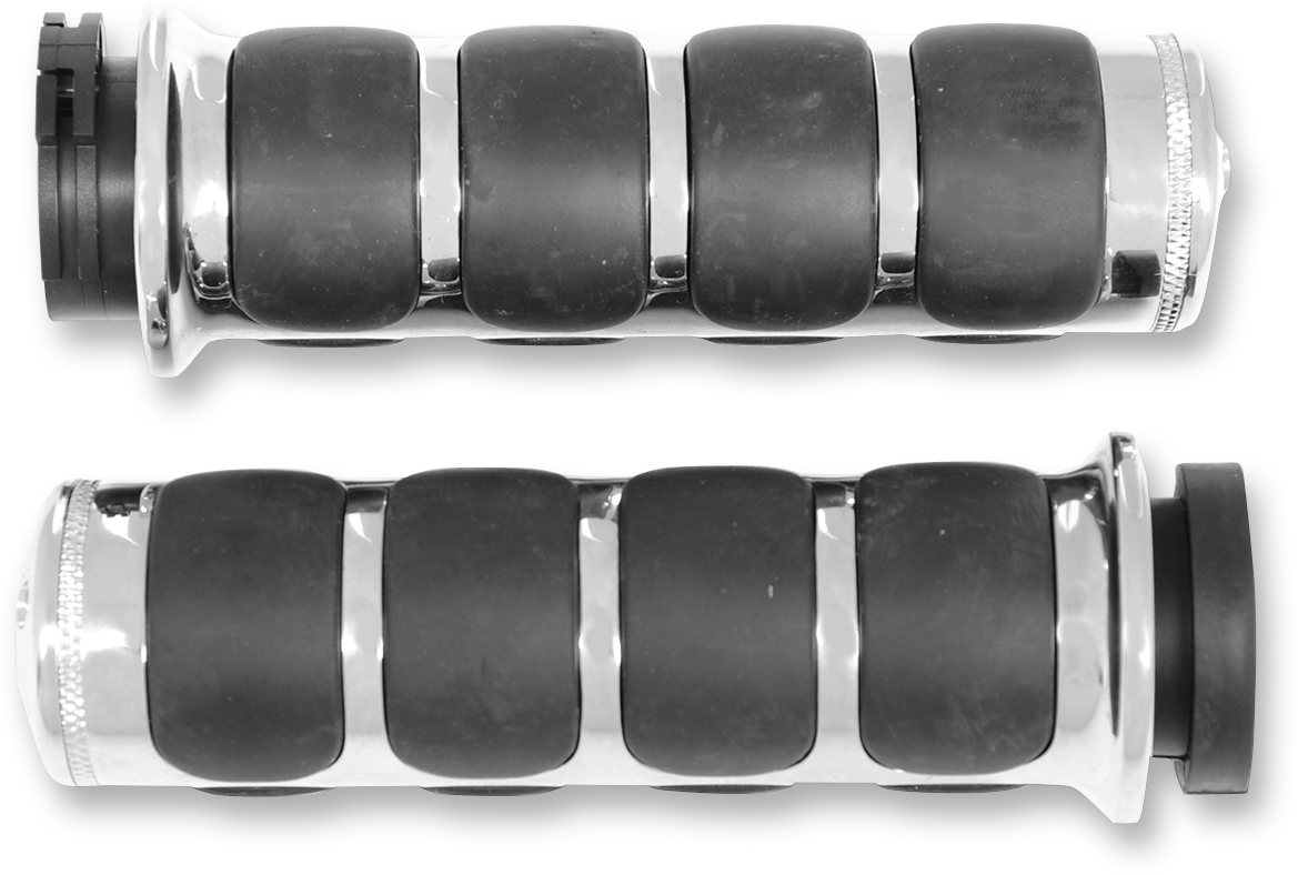 Grips - ISO® - Dual Cable - Chrome ISO®-Grips for Harley Styled to match the popular ISO®-Pegs Recessed area between ISO®-Pads allows cooling airflow in warm weather Dampen handlebar vibration while providing a sure grip Readily accept the ISO®-Throttle Boss (sold separately)