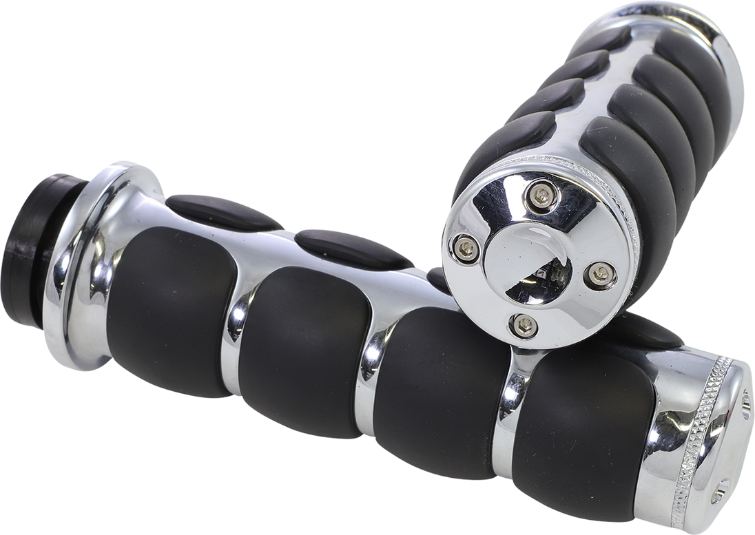 Grips - ISO® - 5-3/4" - Chrome ISO®-Grips — Standard Styled to match the popular ISO®-Pegs Recessed area between ISO®-Pads allows cooling airflow in warm weather Dampen handlebar vibration while providing a sure grip Readily accept the ISO®-Throttle Boss (sold separately)