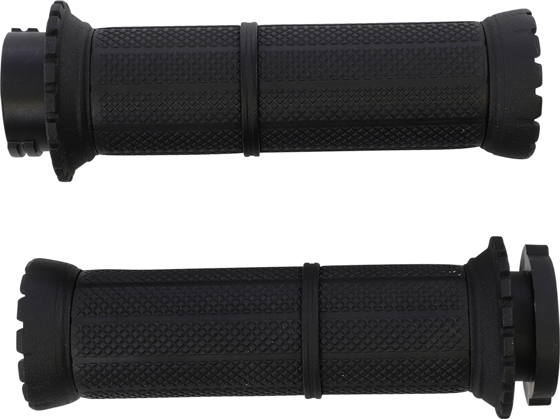 Grips - Riot - Cable - Black Riot Grips for Harley Davidson Grips have MX styling for a thin profile and aggressive look Grip housings are cast aluminum Soft, durable premium EPDM rubber grip compound inserts Trim rings are cast aluminum
