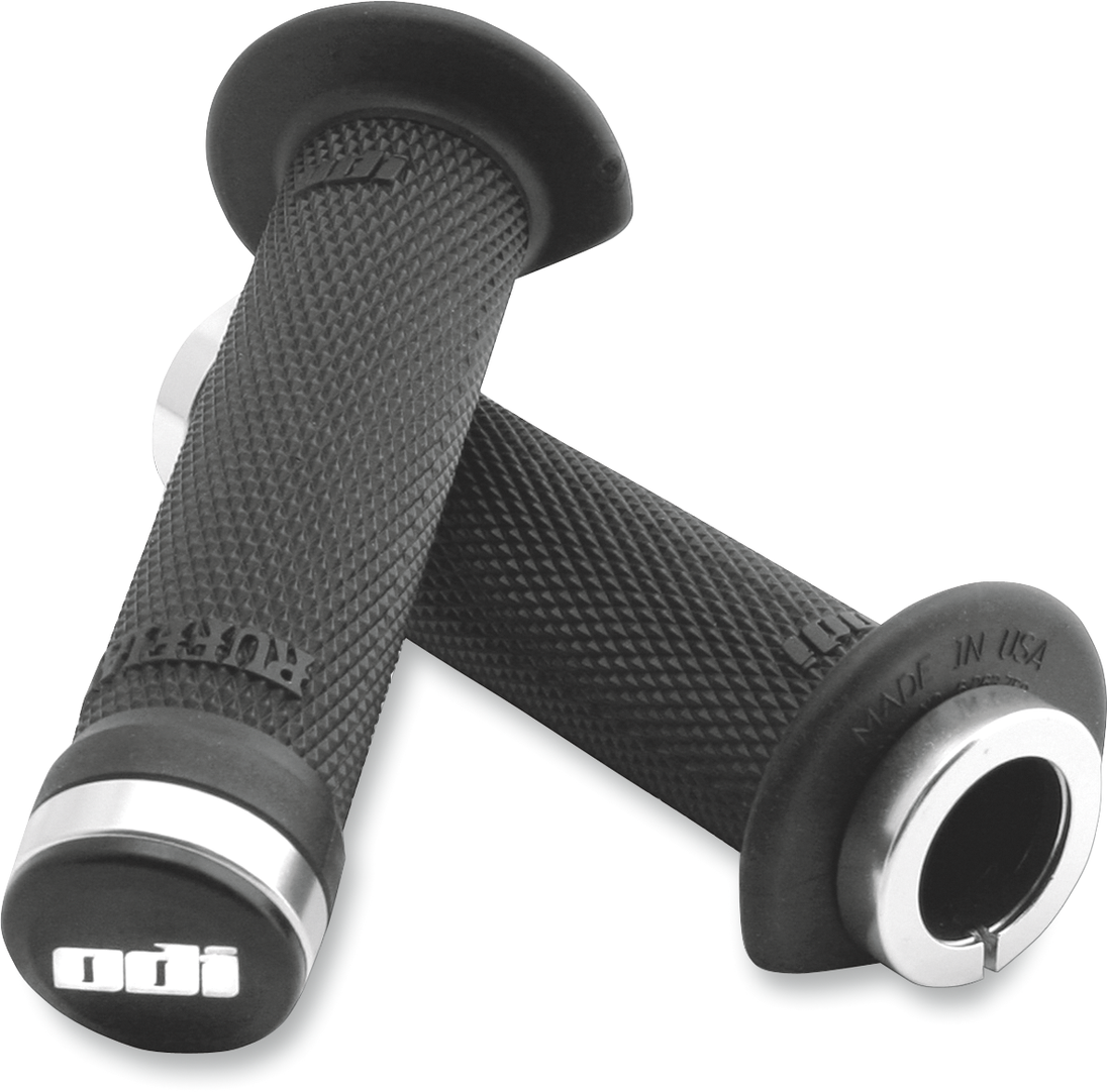 Grips - Lock-On - 120 mm - Black Ruffian Lock-On ATV Grips Featuring ODI's patented Lock-On design for easy no-hassle installation and 100% slip-free performance, the Ruffian provides an ultra-slim profile with a diamondized surface pattern for ultimate traction The exclusive "pre-cut" 3/4 flange protects hands without interfering with thumb throttle
