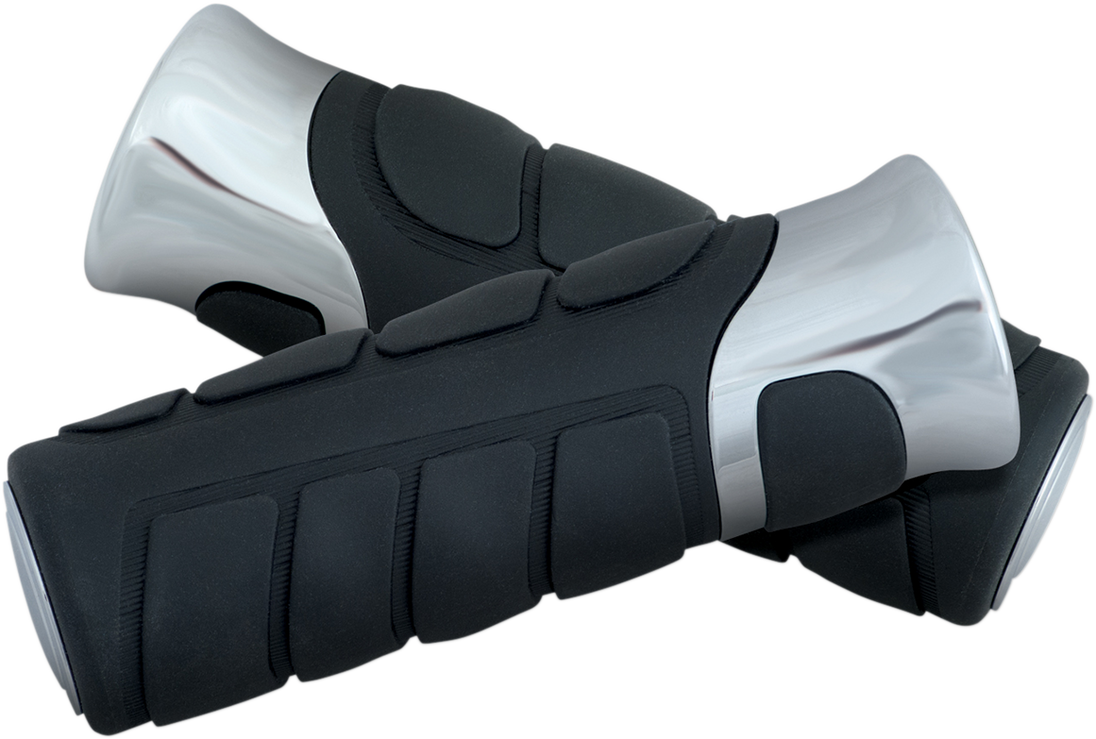 Grips - Solace - 1" Solace Grips Grips combine the right amount of chrome to give rubber grips a good name Made from highly durable Thermoplastic Rubber (TPR) rubber with a cushy feel and contoured finger design Contoured chrome trim encases the raised thumb position area, adding not only comfort but style Ends are finished with a decorative chrome trim piece that can be removed for open-ended grip needs 1-5/8" o.d.