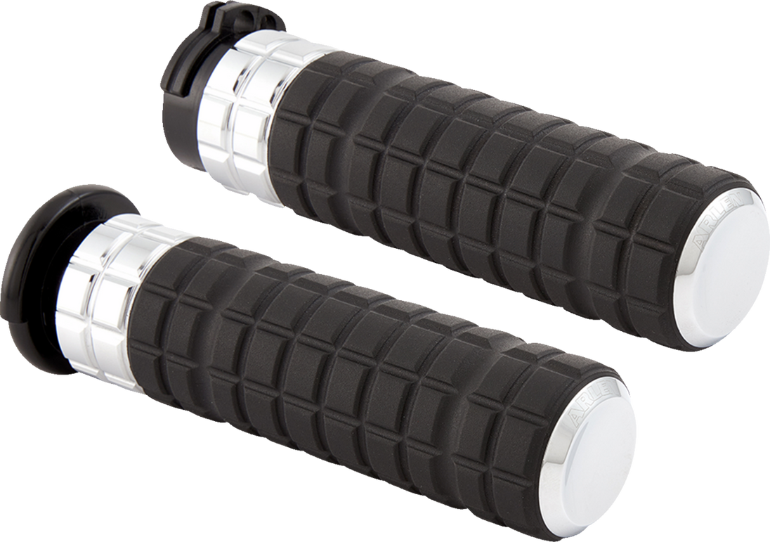 Grips - SpeedLiner - Cable - Chrome SpeedLiner Grips Feature an oversized 3D knurled rubber design with dual integrated channels for comfort and increased grip Excellent hand traction and comfort in all riding scenarios CNC-machined billet inner collar & end cap Arlen Ness® laser logo included on each end cap Internal grip tube design installs like factory grips; no glue required for installation Fitment:
