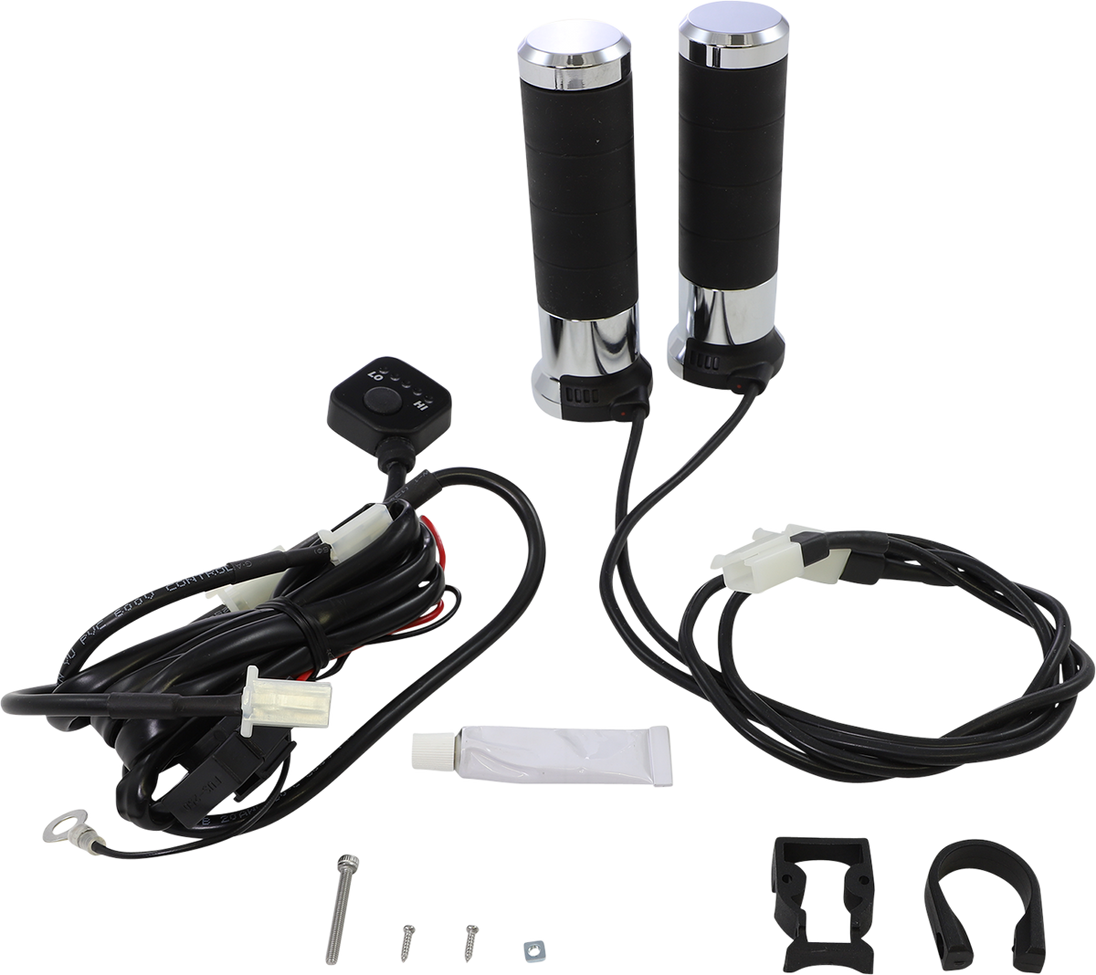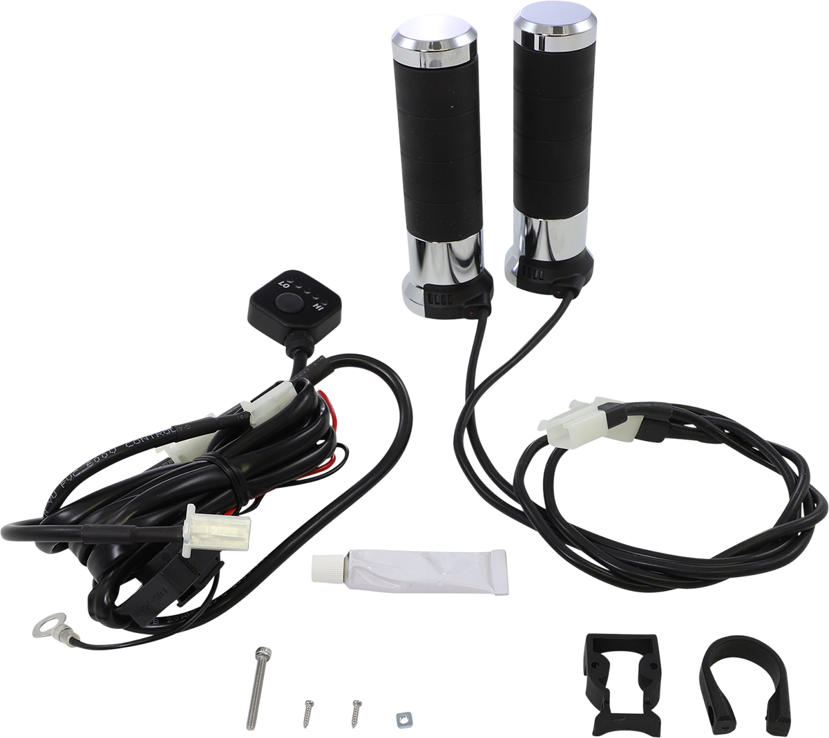 Grips - Heated - Titan - 7/8" - Chrome Titan Heated Grips Special Instructions: ONLY FOR 7/8" BARS 02DLW ONLY FOR 7/8" BARS €††02DLW Five-level temperature controller allows you to adjust the temperature to desired comfort level Made of plated aluminum and special rubber material that is resistant to outdoor conditions and elevated temperatures Thin and flexible silicone wires make them easy to install Provides “short circuit protection” and “low voltage protection” technologies Internal memory that allows the grips to stay at previous warmth level
