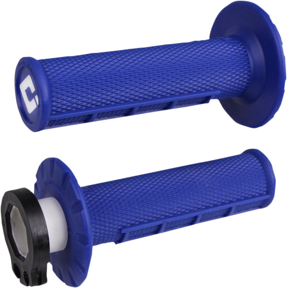 Grips - MX - Half Waffle - Blue V2 Waffle Lock-On Grips ODI has revamped its popular Lock-On MX Grip to make it even better The Lock-On Grip System allows you to change or replace grips in seconds without the need for any wire ties or glues Delivers slip-free performance under any conditions Simple installation and removal without waiting for glue to dry Throttle tube included with snap-on throttle cam to match most modern motocross bikes Knockout ends easily accommodate hand guards Compatible with V2 throttle cams for additional fitment options Made in the U.S.A.