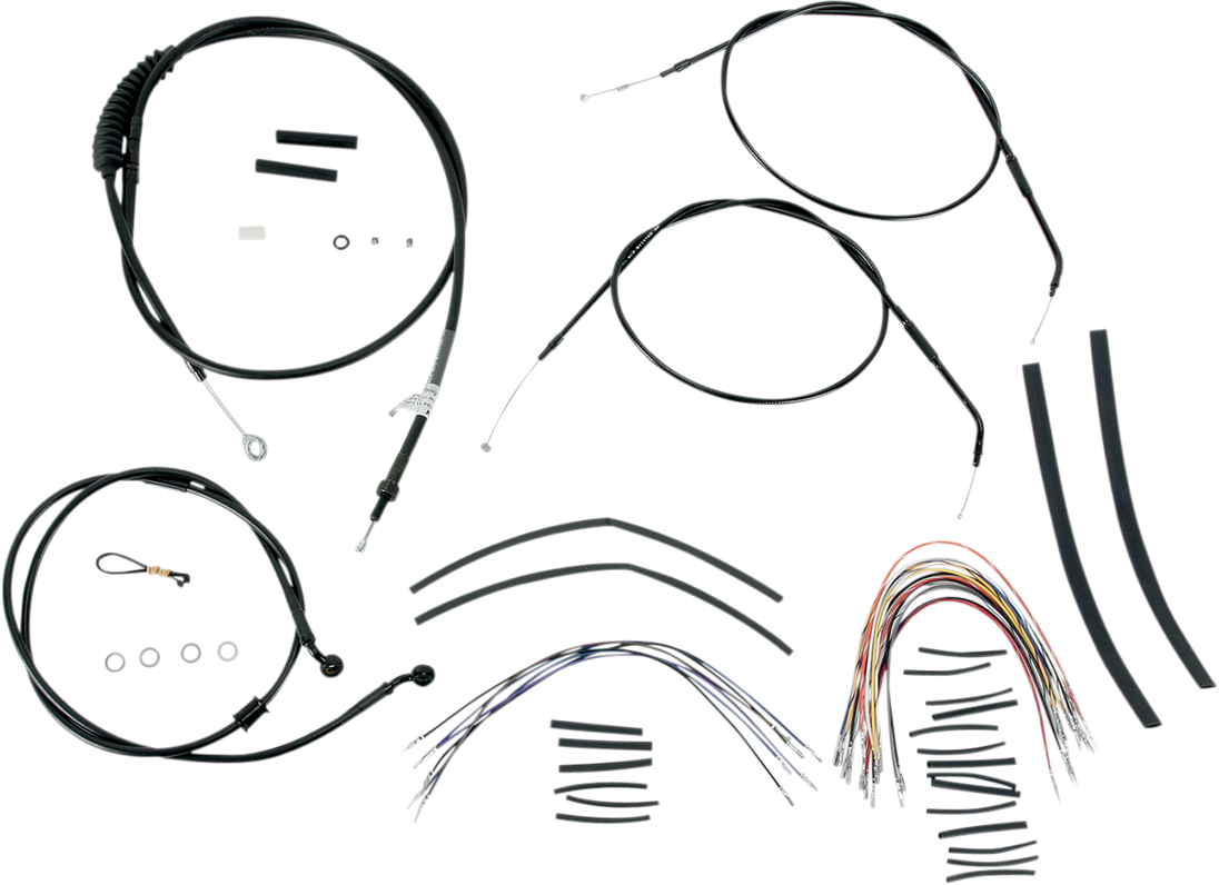 Control Kit - 14" Ape Hanger Handlebars Complete Black Vinyl Handlebar Cable/Line Kit for Ape Hanger Handlebars Complete installation kit for Burly Ape hangers Kit includes extended brake line (unless noted), extended clutch cable/clutch line, extended throttle/idle cables as required and all necessary wiring Brake lines, when included, feature PTFE inner liner and heavy-duty stainless steel outer braid Dresser kits reuse stock Throttle-By-Wire harness Kit is based on using 2" risers with ape hanger-style handlebars. Fitment: