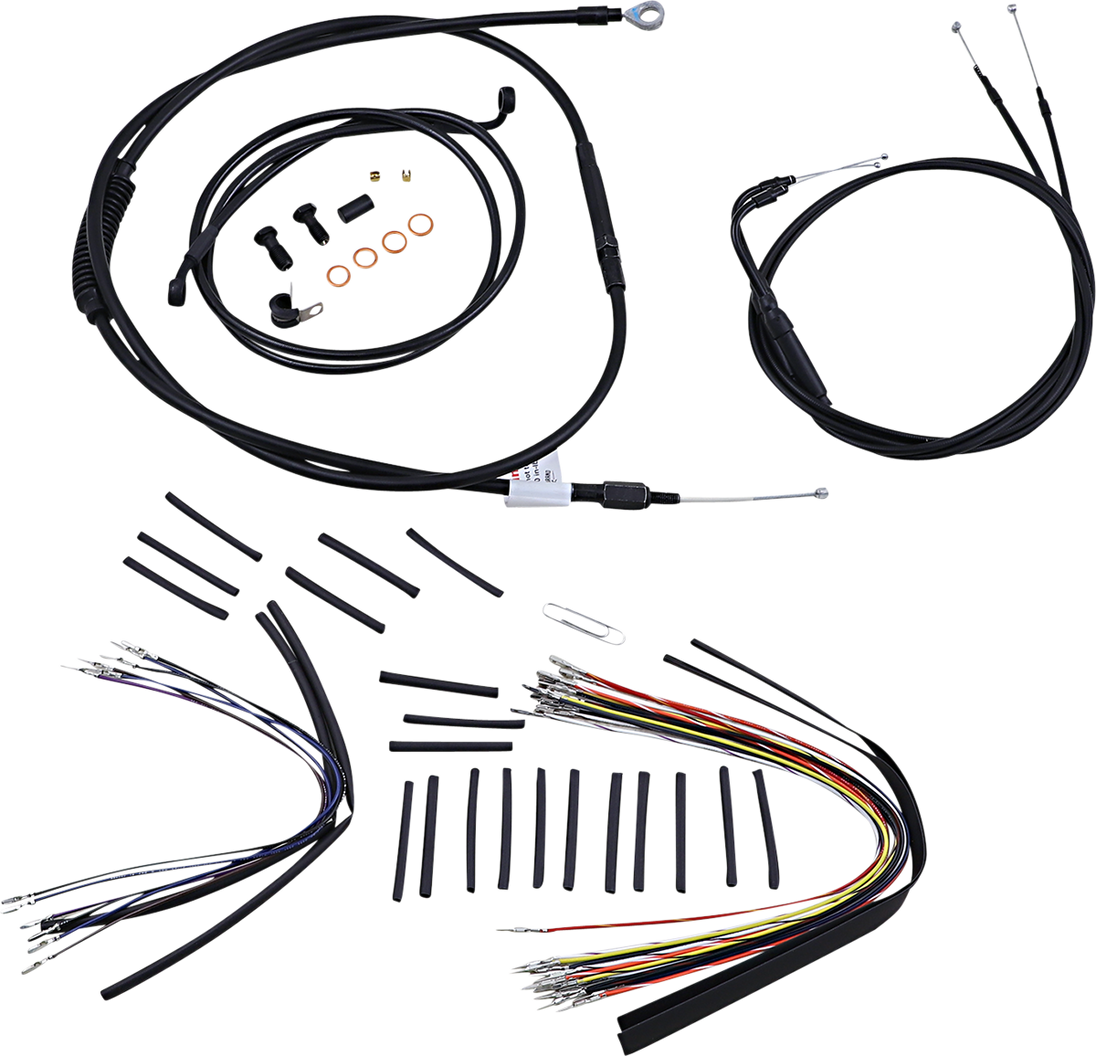 Control Kit - 14" Ape Hanger Handlebars Complete Black Vinyl Handlebar Cable/Line Kit for Ape Hanger Handlebars Complete installation kit for Burly Ape hangers Kit includes extended brake line (unless noted), extended clutch cable/clutch line, extended throttle/idle cables as required and all necessary wiring Brake lines, when included, feature PTFE inner liner and heavy-duty stainless steel outer braid Dresser kits reuse stock Throttle-By-Wire harness Kit is based on using 2" risers with ape hanger-style handlebars. Fitment: