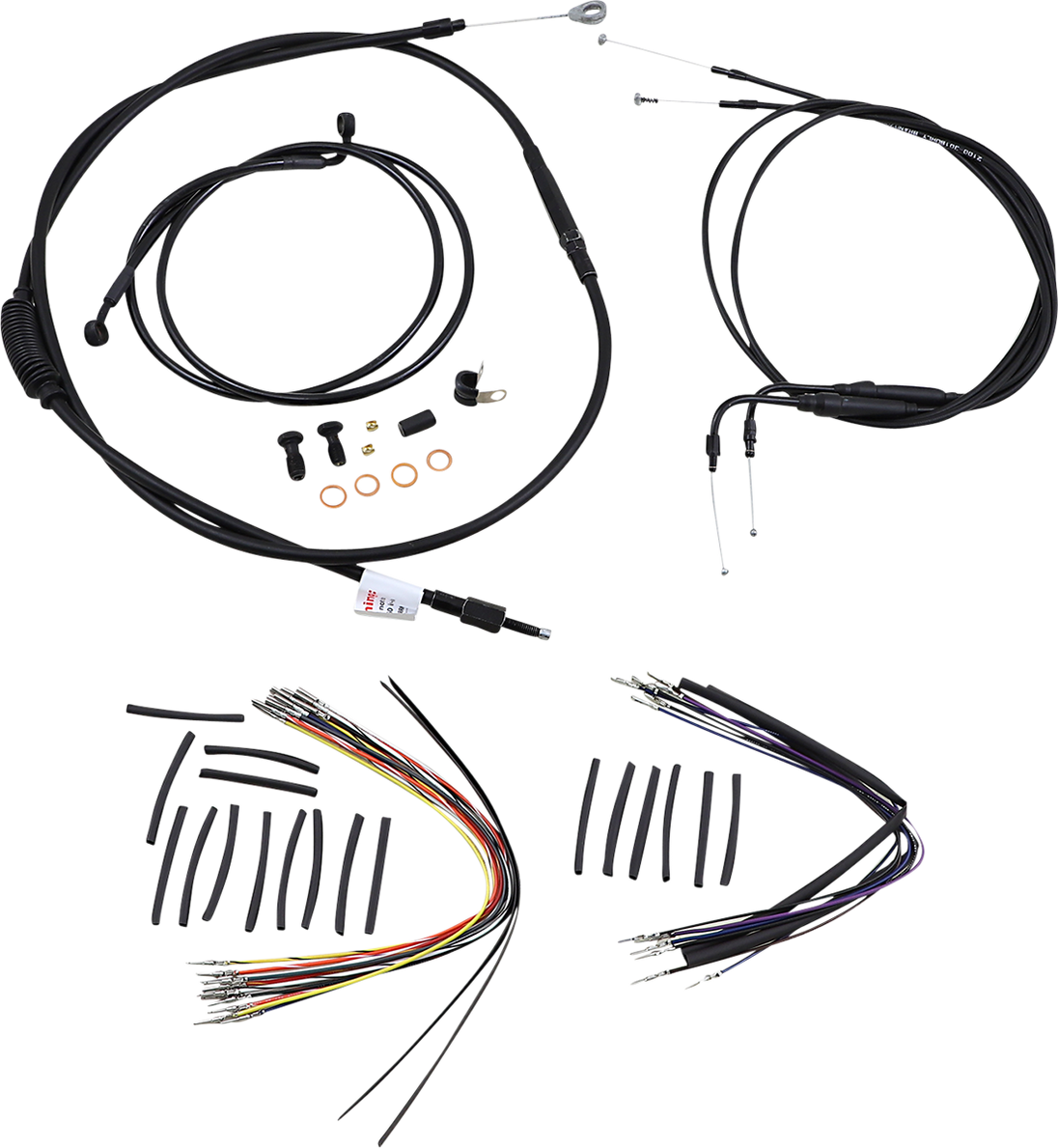Control Kit - 16" Ape Hanger Handlebars Complete Black Vinyl Handlebar Cable/Line Kit for Ape Hanger Handlebars Complete installation kit for Burly Ape hangers Kit includes extended brake line (unless noted), extended clutch cable/clutch line, extended throttle/idle cables as required and all necessary wiring Brake lines, when included, feature PTFE inner liner and heavy-duty stainless steel outer braid Dresser kits reuse stock Throttle-By-Wire harness Kit is based on using 2" risers with ape hanger-style handlebars. Fitment: