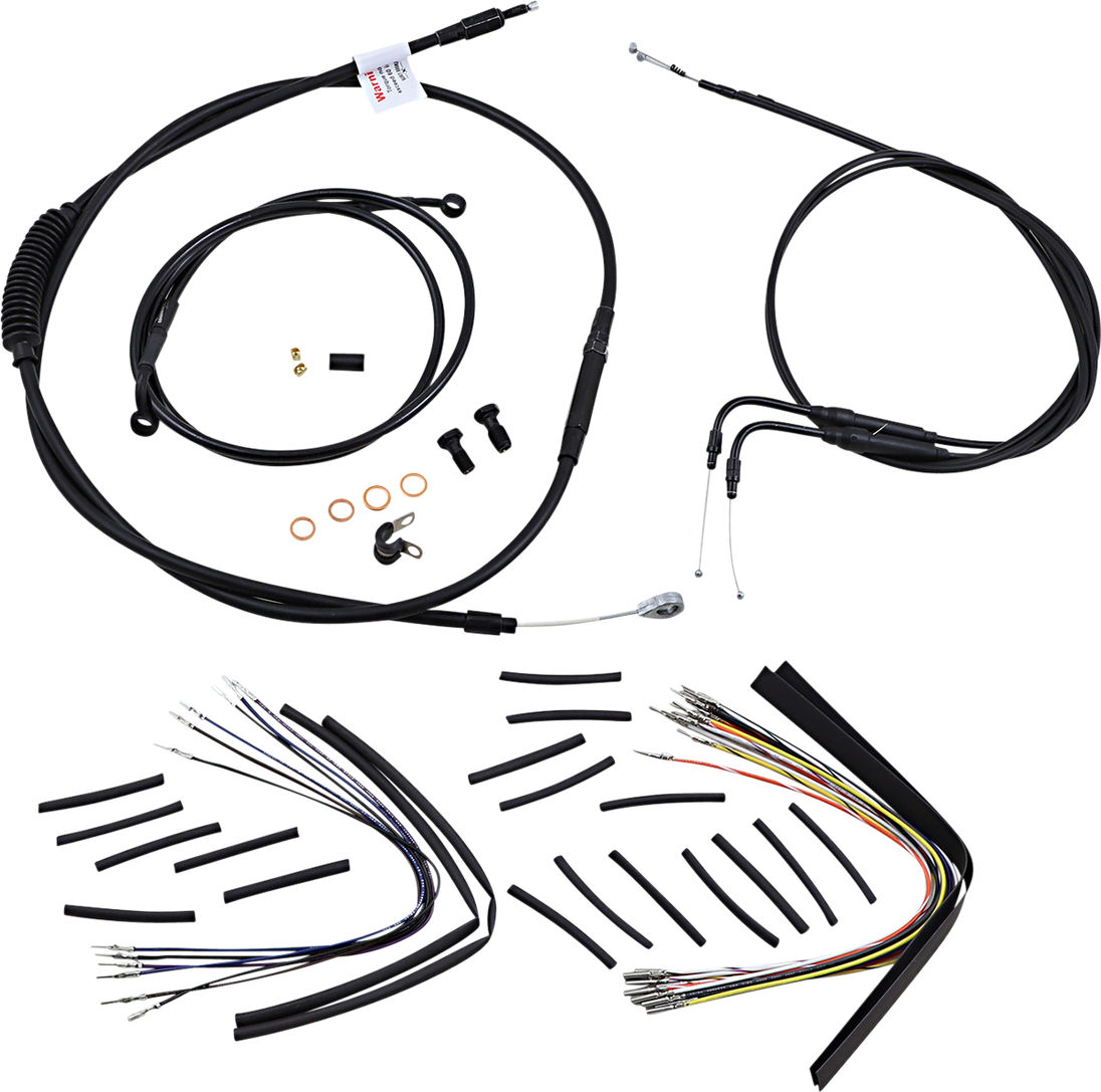 Control Kit - 16" Ape Hanger Handlebars Complete Black Vinyl Handlebar Cable/Line Kit for Ape Hanger Handlebars Complete installation kit for Burly Ape hangers Kit includes extended brake line (unless noted), extended clutch cable/clutch line, extended throttle/idle cables as required and all necessary wiring Brake lines, when included, feature PTFE inner liner and heavy-duty stainless steel outer braid Dresser kits reuse stock Throttle-By-Wire harness Kit is based on using 2" risers with ape hanger-style handlebars. Fitment: