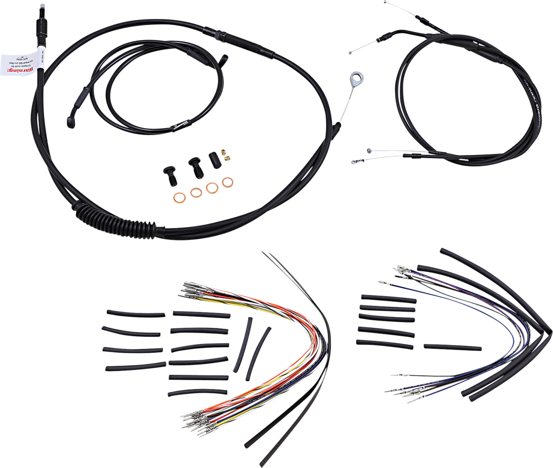 Control Kit - 12" Ape Hanger Handlebars Complete Black Vinyl Handlebar Cable/Line Kit for Ape Hanger Handlebars Complete installation kit for Burly Ape hangers Kit includes extended brake line (unless noted), extended clutch cable/clutch line, extended throttle/idle cables as required and all necessary wiring Brake lines, when included, feature PTFE inner liner and heavy-duty stainless steel outer braid Dresser kits reuse stock Throttle-By-Wire harness Kit is based on using 2" risers with ape hanger-style handlebars. Fitment: