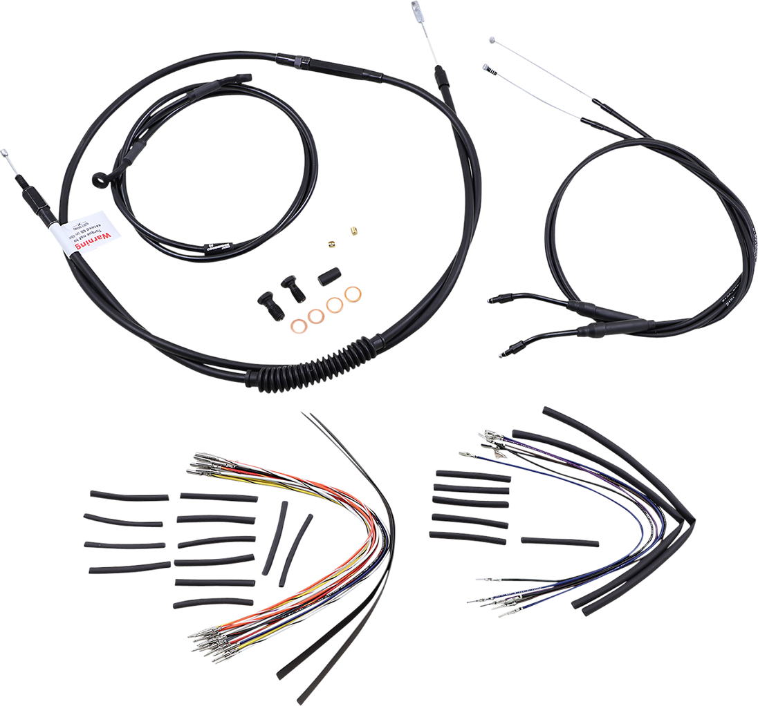 Control Kit - 14" Ape Hanger Handlebars Complete Black Vinyl Handlebar Cable/Line Kit for Ape Hanger Handlebars Complete installation kit for Burly Ape hangers Kit includes extended brake line (unless noted), extended clutch cable/clutch line, extended throttle/idle cables as required and all necessary wiring Brake lines, when included, feature PTFE inner liner and heavy-duty stainless steel outer braid Dresser kits reuse stock Throttle-By-Wire harness Kit is based on using 2" risers with ape hanger-style handlebars. Fitment: