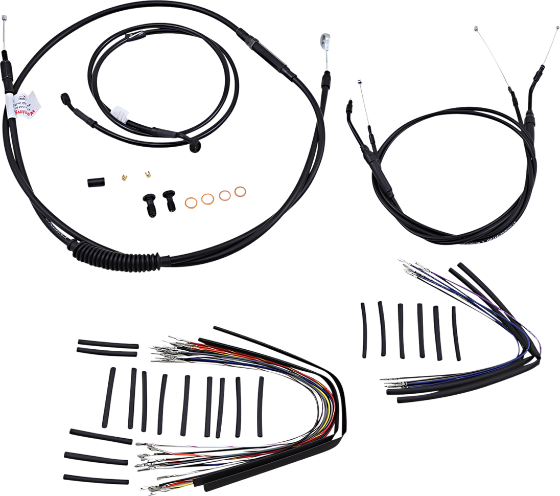 Control Kit - 14" Ape Hanger Handlebars Complete Black Vinyl Handlebar Cable/Line Kit for Ape Hanger Handlebars Complete installation kit for Burly Ape hangers Kit includes extended brake line (unless noted), extended clutch cable/clutch line, extended throttle/idle cables as required and all necessary wiring Brake lines, when included, feature PTFE inner liner and heavy-duty stainless steel outer braid Dresser kits reuse stock Throttle-By-Wire harness Kit is based on using 2" risers with ape hanger-style handlebars. Fitment: