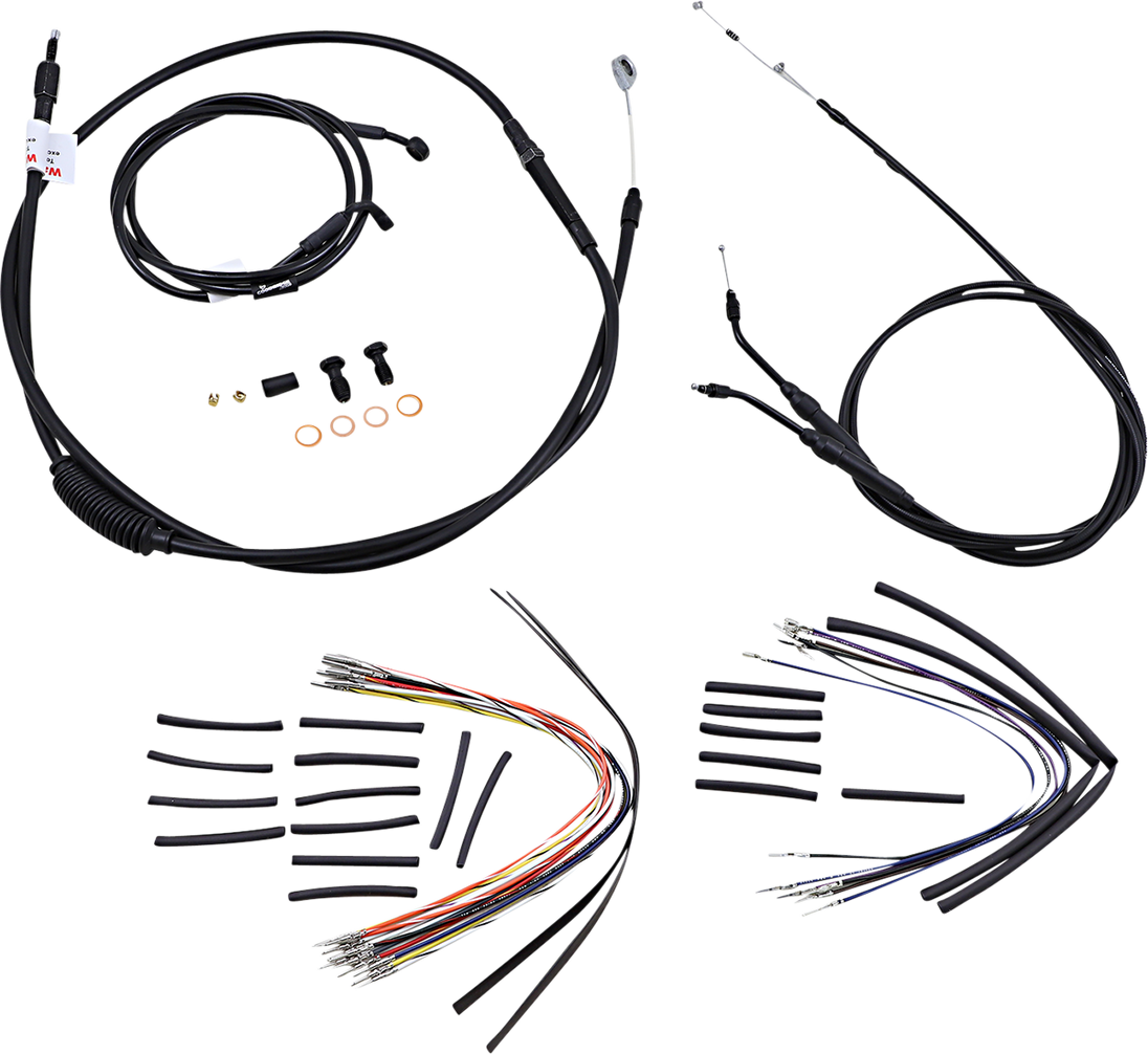 Control Kit - 16" Ape Hanger Handlebars Complete Black Vinyl Handlebar Cable/Line Kit for Ape Hanger Handlebars Complete installation kit for Burly Ape hangers Kit includes extended brake line (unless noted), extended clutch cable/clutch line, extended throttle/idle cables as required and all necessary wiring Brake lines, when included, feature PTFE inner liner and heavy-duty stainless steel outer braid Dresser kits reuse stock Throttle-By-Wire harness Kit is based on using 2" risers with ape hanger-style handlebars. Fitment: