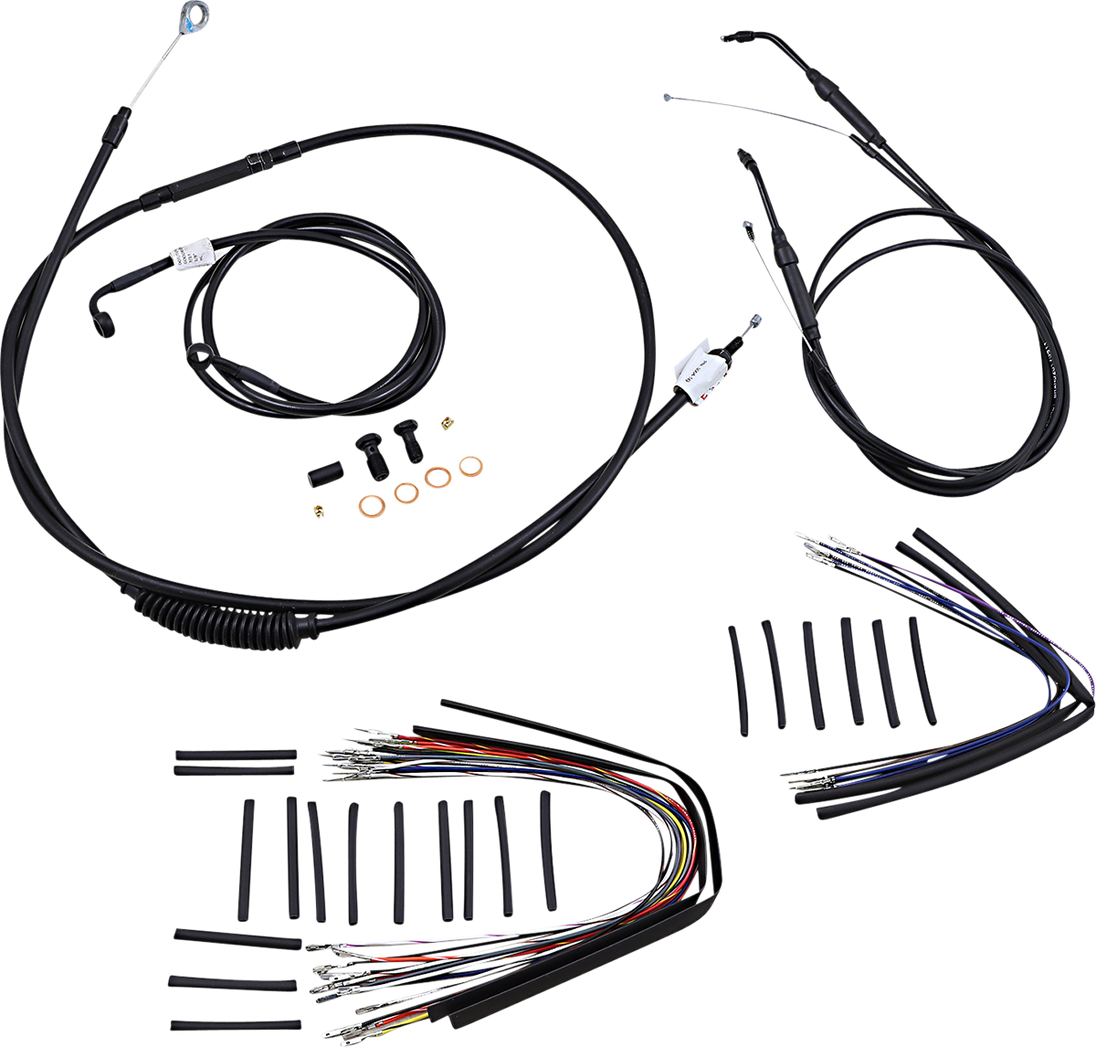 Control Kit - 16" Ape Hanger Handlebars Complete Black Vinyl Handlebar Cable/Line Kit for Ape Hanger Handlebars Complete installation kit for Burly Ape hangers Kit includes extended brake line (unless noted), extended clutch cable/clutch line, extended throttle/idle cables as required and all necessary wiring Brake lines, when included, feature PTFE inner liner and heavy-duty stainless steel outer braid Dresser kits reuse stock Throttle-By-Wire harness Kit is based on using 2" risers with ape hanger-style handlebars. Fitment: