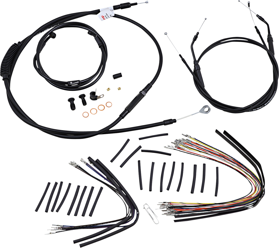 Control Kit - 16" Ape Hanger Handlebars Complete Black Vinyl Handlebar Cable/Line Kit for Ape Hanger Handlebars Complete installation kit for Burly Ape hangers Kit includes extended brake line (unless noted), extended clutch cable/clutch line, extended throttle/idle cables as required and all necessary wiring Brake lines, when included, feature PTFE inner liner and heavy-duty stainless steel outer braid Dresser kits reuse stock Throttle-By-Wire harness Kit is based on using 2" risers with ape hanger-style handlebars. Fitment: