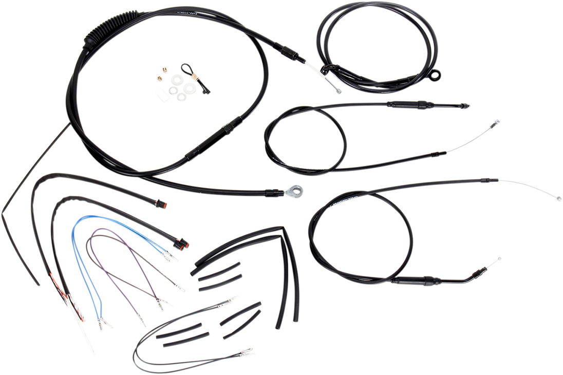 Control Kit - 12" Ape Hanger Handlebars Complete Black Vinyl Handlebar Cable/Line Kit for Ape Hanger Handlebars Complete installation kit for Burly Ape hangers Kit includes extended brake line (unless noted), extended clutch cable/clutch line, extended throttle/idle cables as required and all necessary wiring Brake lines, when included, feature PTFE inner liner and heavy-duty stainless steel outer braid Dresser kits reuse stock Throttle-By-Wire harness Kit is based on using 2" risers with ape hanger-style handlebars. Fitment: