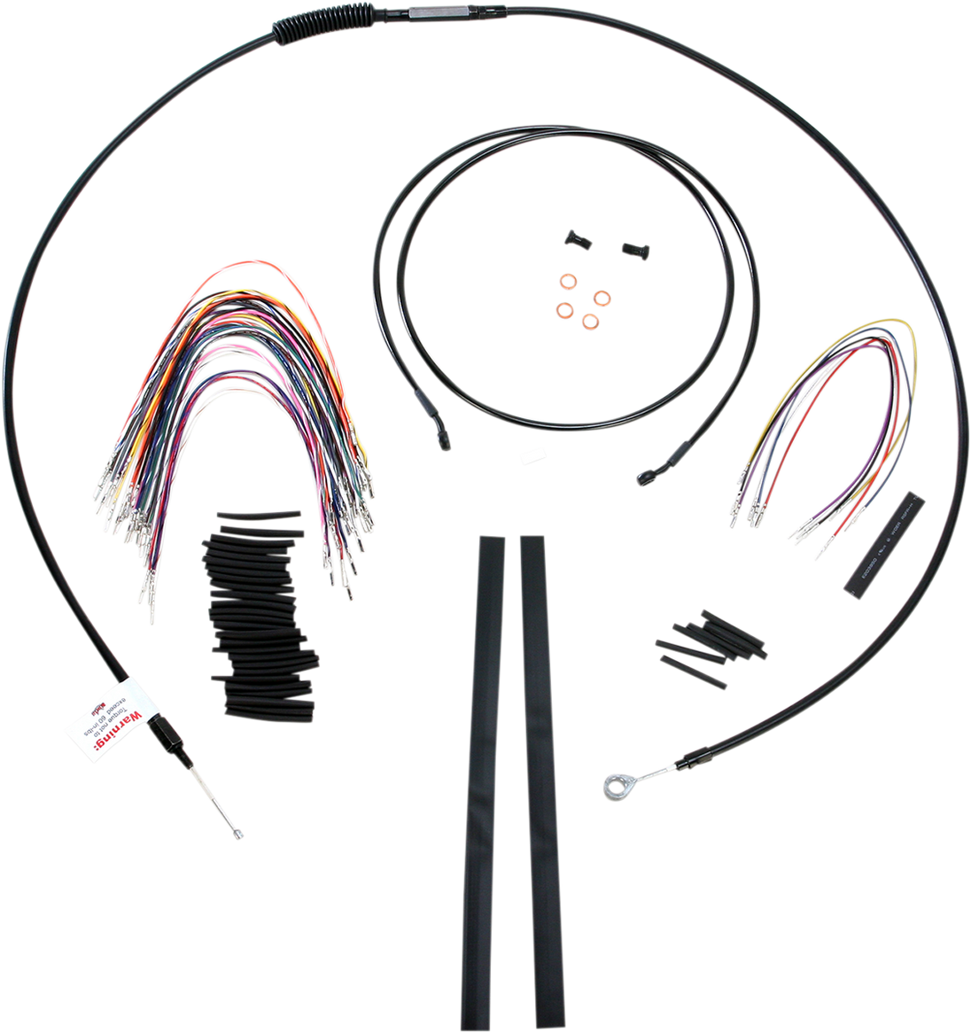 Control Kit - 15" Ape Hanger Handlebars Complete Black Vinyl Handlebar Cable/Line Kit for Ape Hanger Handlebars Complete installation kit for Burly Ape hangers Kit includes extended brake line (unless noted), extended clutch cable/clutch line, extended throttle/idle cables as required and all necessary wiring Brake lines, when included, feature PTFE inner liner and heavy-duty stainless steel outer braid Dresser kits reuse stock Throttle-By-Wire harness Kit is based on using 2" risers with ape hanger-style handlebars. Fitment: