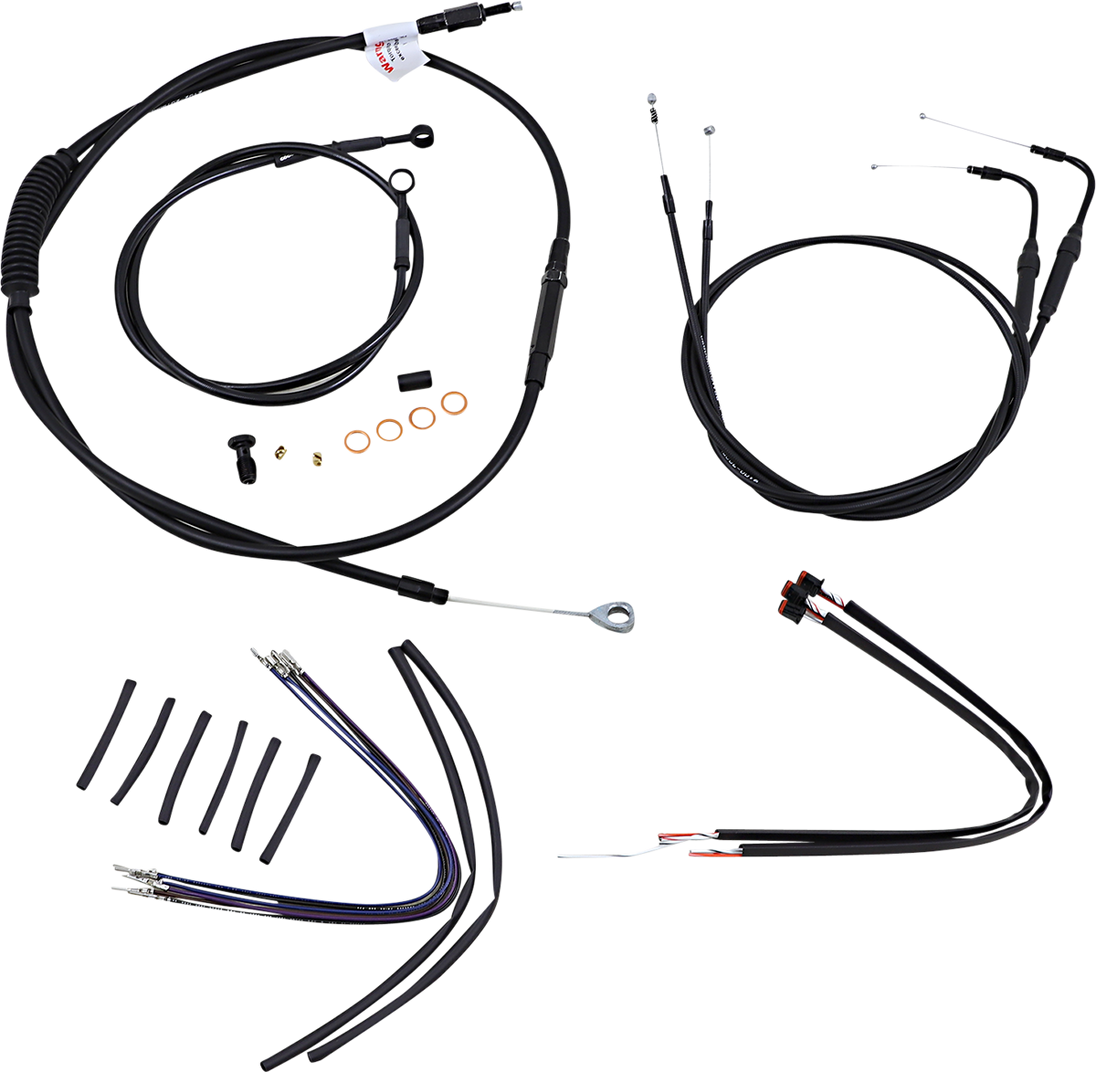 Control Kit - 16" Ape Hanger Handlebars - ABS Complete Black Vinyl Handlebar Cable/Line Kit for Ape Hanger Handlebars Complete installation kit for Burly Ape hangers Kit includes extended brake line (unless noted), extended clutch cable/clutch line, extended throttle/idle cables as required and all necessary wiring Brake lines, when included, feature PTFE inner liner and heavy-duty stainless steel outer braid Dresser kits reuse stock Throttle-By-Wire harness Kit is based on using 2" risers with ape hanger-style handlebars. Fitment: