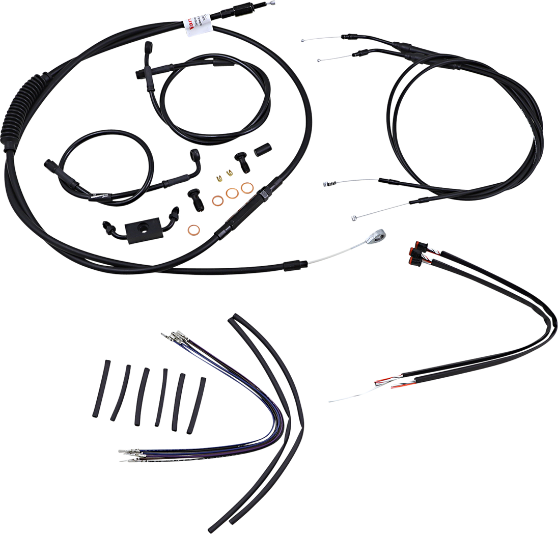 Control Kit - 16" Ape Hanger Handlebars - ABS Complete Black Vinyl Handlebar Cable/Line Kit for Ape Hanger Handlebars Special Instructions: N/F FXDL ?02MAF N/F FXDL €‡œ?02MAF Complete installation kit for Burly Ape hangers Kit includes extended brake line (unless noted), extended clutch cable/clutch line, extended throttle/idle cables as required and all necessary wiring Brake lines, when included, feature PTFE inner liner and heavy-duty stainless steel outer braid Dresser kits reuse stock Throttle-By-Wire harness Kit is based on using 2" risers with ape hanger-style handlebars. Fitment: