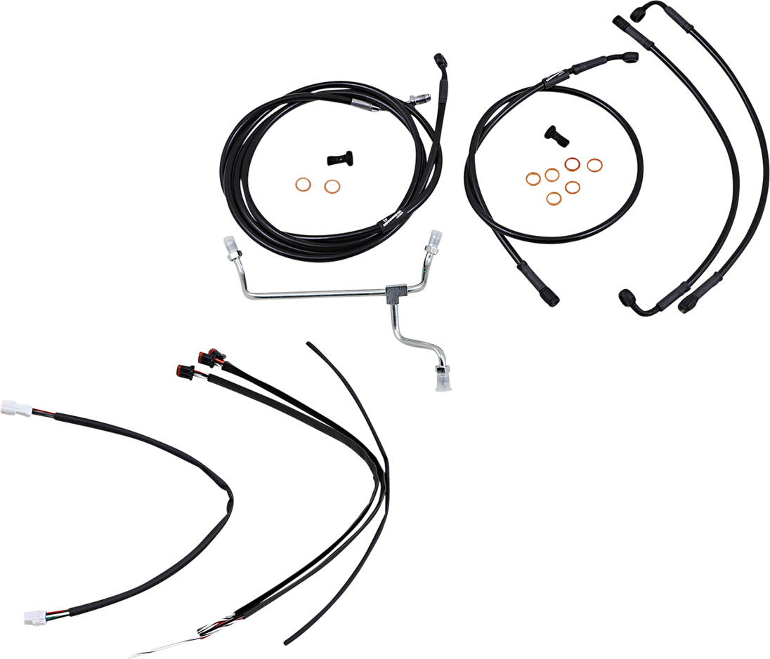 Control Kit - 18" Ape Hanger Handlebars Complete Black Vinyl Handlebar Cable/Line Kit for Ape Hanger Handlebars Complete installation kit for Burly Ape hangers Kit includes extended brake line (unless noted), extended clutch cable/clutch line, extended throttle/idle cables as required and all necessary wiring Brake lines, when included, feature PTFE inner liner and heavy-duty stainless steel outer braid Dresser kits reuse stock Throttle-By-Wire harness Kit is based on using 2" risers with ape hanger-style handlebars. Fitment: