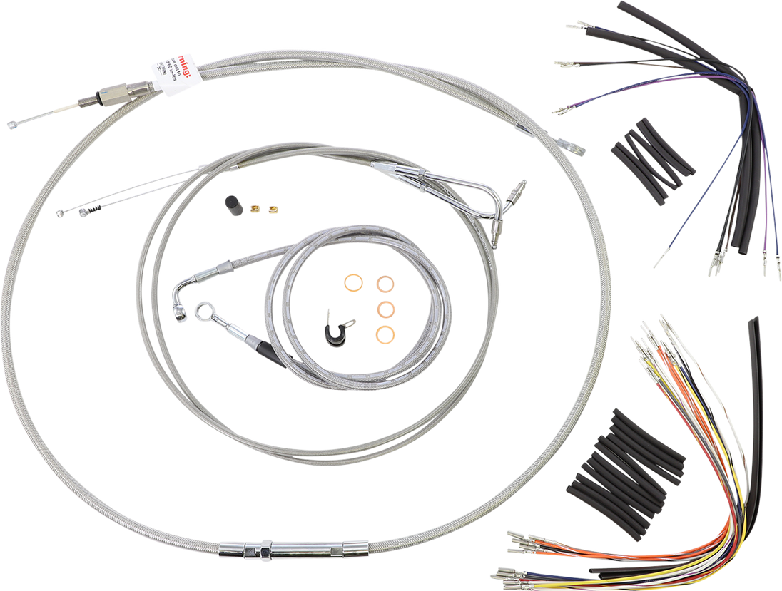 Handlebar Cable/Brake Line Kit - Complete - 14" Ape Hanger Handlebars - Stainless Steel Complete Stainless Braided Handlebar Cable/Brake Line Kit Complete installation kit for Burly Ape hangers Kit includes extended brake line, extended clutch cable/clutch line, extended throttle/idle cables as required and all necessary wiring Brake lines feature PTFE inner liner and heavy-duty stainless steel outer braid Dresser kits reuse stock Throttle-By-Wire harness Kit is based on using 2" risers with ape hanger-style handlebars. Fitment:
