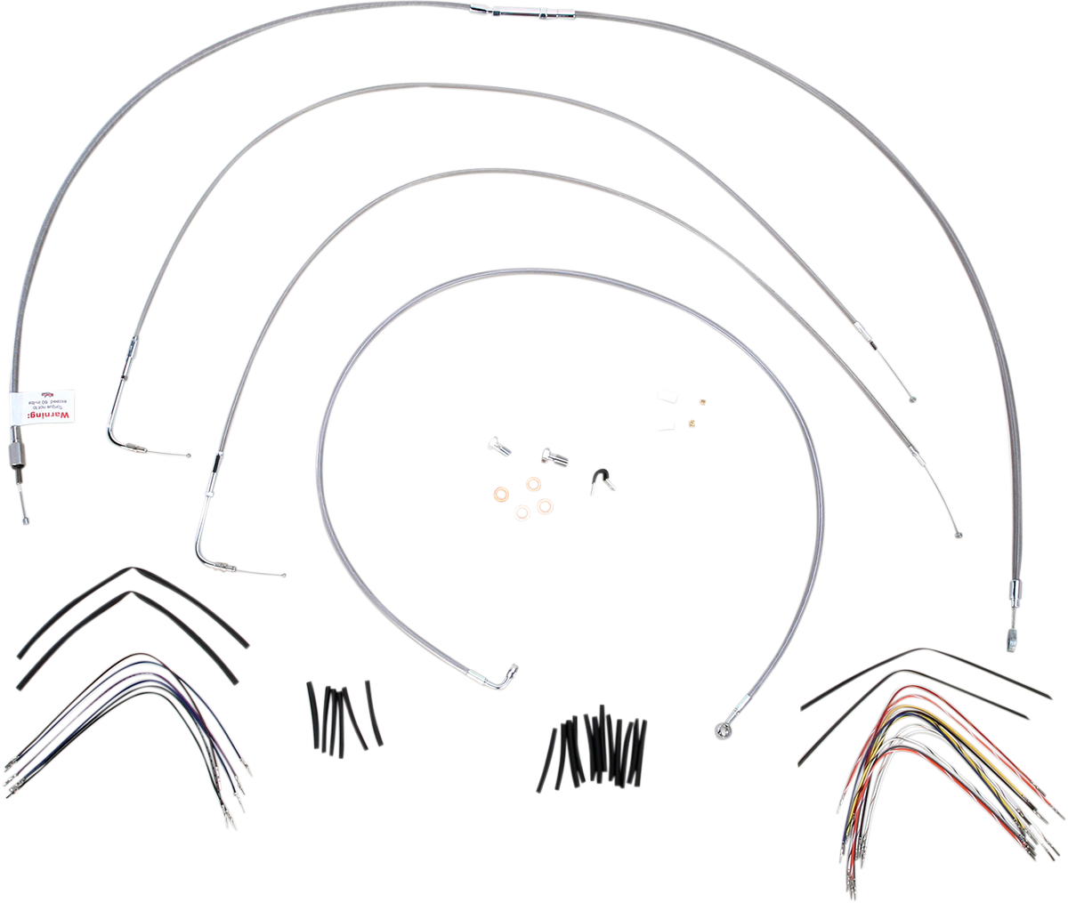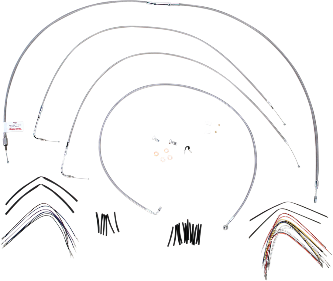 Handlebar Cable/Brake Line Kit - Complete - 16" Ape Hanger Handlebars - Stainless Steel Complete Stainless Braided Handlebar Cable/Brake Line Kit Complete installation kit for Burly Ape hangers Kit includes extended brake line, extended clutch cable/clutch line, extended throttle/idle cables as required and all necessary wiring Brake lines feature PTFE inner liner and heavy-duty stainless steel outer braid Dresser kits reuse stock Throttle-By-Wire harness Kit is based on using 2" risers with ape hanger-style handlebars. Fitment: