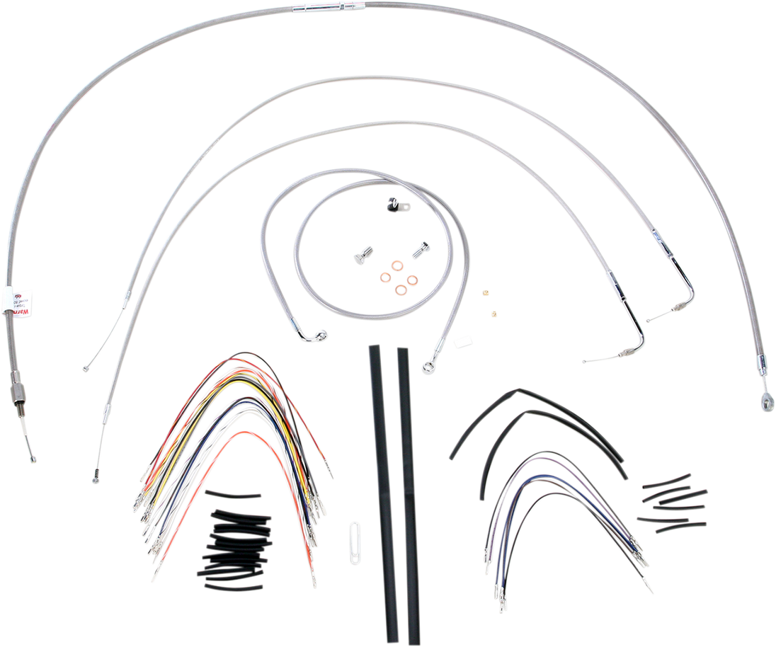 Handlebar Cable/Brake Line Kit - Complete - 16" Ape Hanger Handlebars - Stainless Steel Complete Stainless Braided Handlebar Cable/Brake Line Kit Complete installation kit for Burly Ape hangers Kit includes extended brake line, extended clutch cable/clutch line, extended throttle/idle cables as required and all necessary wiring Brake lines feature PTFE inner liner and heavy-duty stainless steel outer braid Dresser kits reuse stock Throttle-By-Wire harness Kit is based on using 2" risers with ape hanger-style handlebars. Fitment: