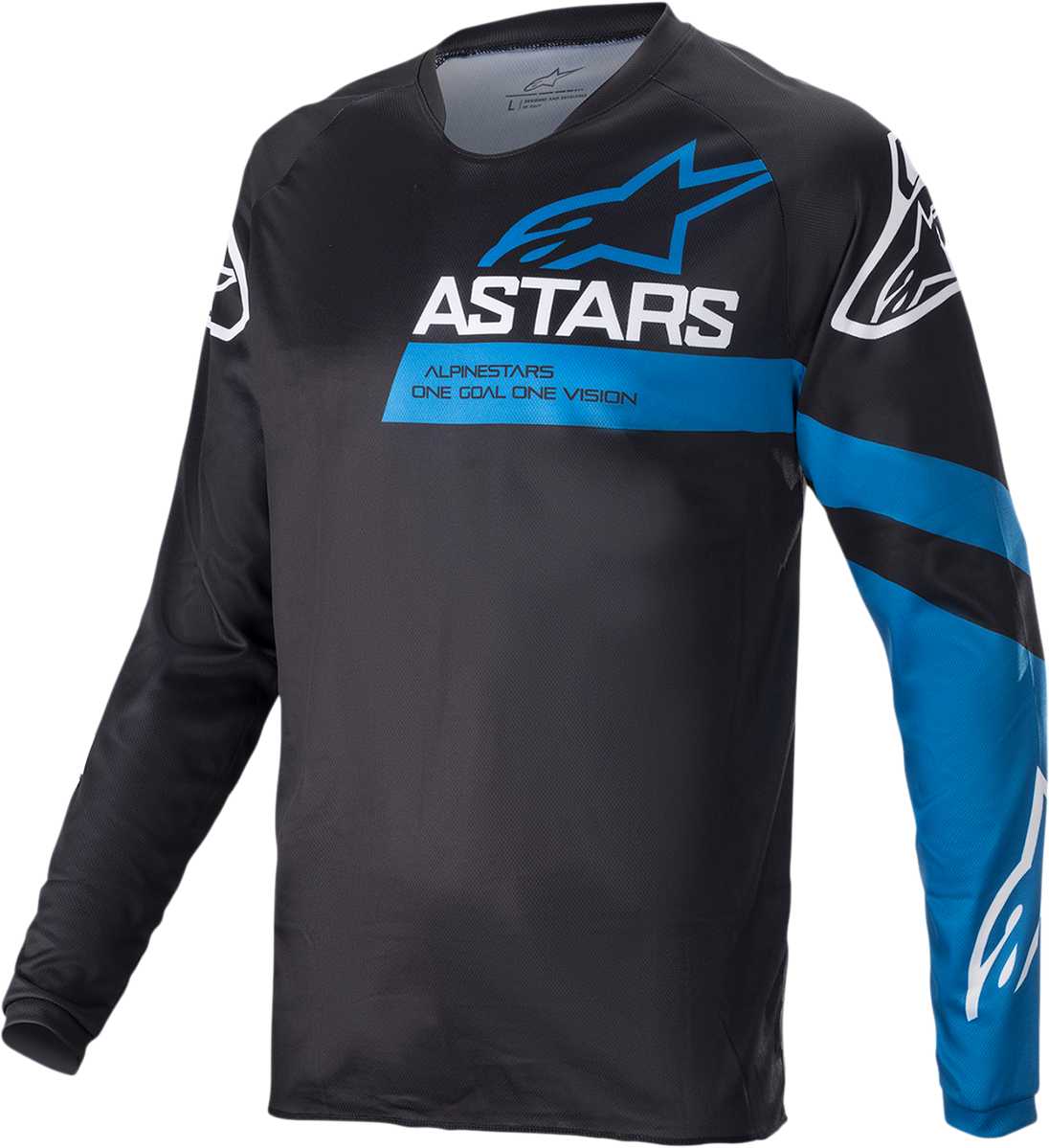Racer V3 Long-Sleeve Jersey - Black/Bright Blue - 2XL Racer V3 Long-Sleeve Jersey Lightweight, durable and moisture-wicking fabric for maximum performance while riding Cut longer in the rear area for compatibility with Alpinestars’ MTB pants and shorts Stretch collar neck construction for fit and comfort Fade resistant sublimated graphics