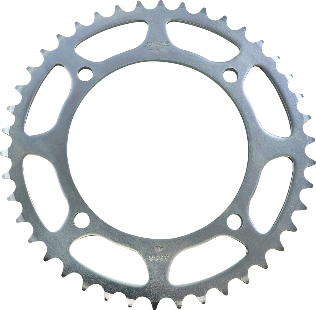 Rear Sprocket - 42 Tooth - Yamaha Steel Rear Sprocket Sunstar is the largest OEM and aftermarket supplier of motorcycle and ARV sprockets in the manufacturing world for every major Japanese motorcycle builder since 1946 Computer-designed weight reduction holes for the best combination of lightness, strength and stability Exclusive tooth-valley design provides 50% better chain contact area for the best power transfer possible Cleaning grooves added at bottom of tooth area Fitment: