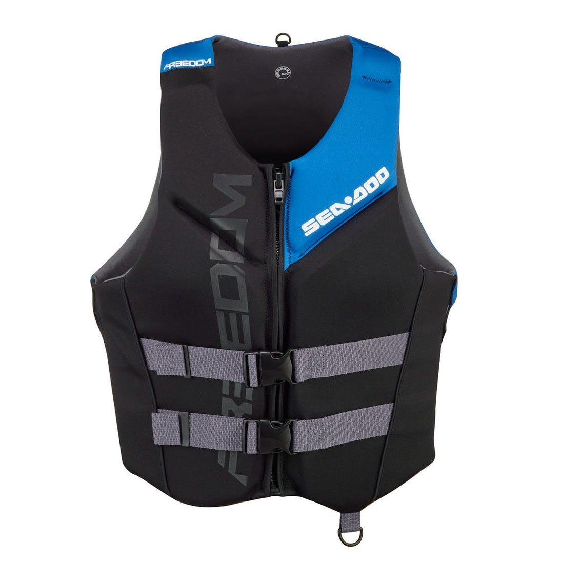FREEDOM PFD (US/CA) MEN 3XL Features: PFD with a ultra-durable ecoprene outer shell. Environmentally friendly ecoprene material that is rubber free, flexible, lightweight, breathable and quick dry. Combination of PVC and polyethylene foam inserts. Lumbar comfort zone: Extra foam padding to minimize the pressure on your lower back while bolstering support. Mesh panel: Drain away excess water for quick drying and thermal regulated comfort. Comfortable fit. YKK front zipper. Segmentations at front and back for better comfort and ease of movement. Side panels in stretch lining fabric for improved comfort. Armholes cut large for riding comfort. Loop at back neck to attach your goggles to your vest. D-ring for key lanyard. Coast Guard approved.