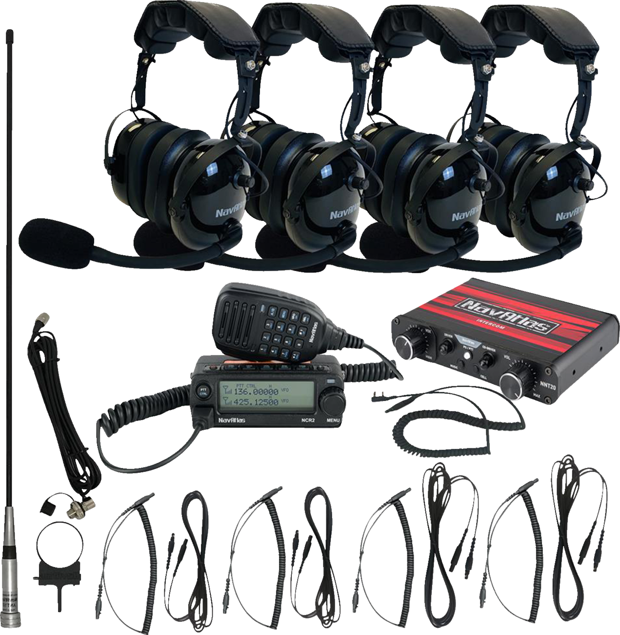 Kit includes: 1 NNT20 Intercom and 1 NCR2 Car-to-Car Radio, 2 Pair NO303 Over-the-Head (Stereo) Headsets, 2 PSC41 (PTT) push-to-talk cables, 2 HCF4 (Front) 4’ (EU: 10,16 cm) coil cables connecting the headsets to the HEC10 extension cables, 2 HEC10 (Front) 10’ (EU: 25,4 cm) extension cables connecting the intercom to the HCF4 coil cables to headsets and 1 APKG1 Dual Band Antenna with multiple mounting options