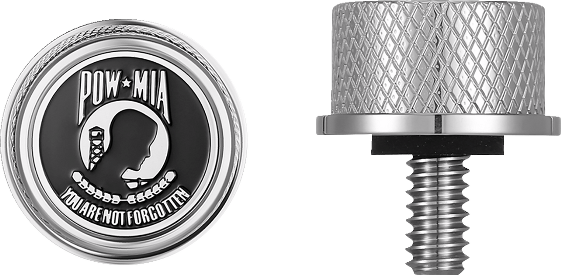 Seat Mounting Knob - Stainless Steel - POW MIA Seat Mounting Knob Knurled knob is easy to install or remove without tools A raised motif to complete that custom look Made from 316L stainless steel SAE 1/4"-20 thread Does not fit seats equipped with spring-loaded rear seat bracket. Fitment: