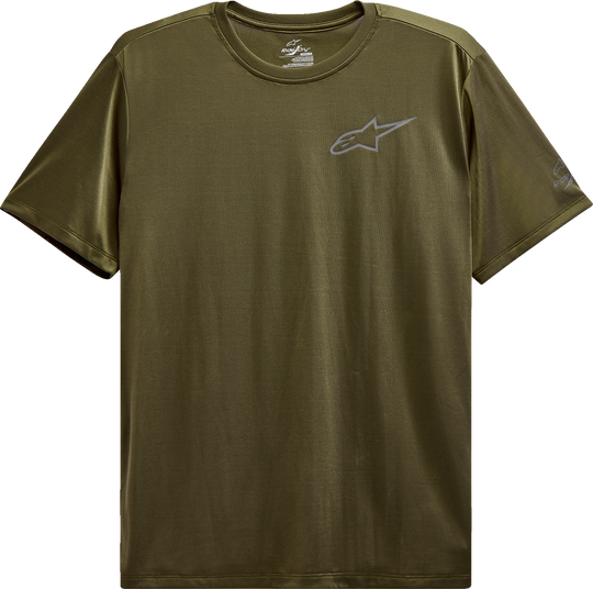 Pursue Performance T-Shirt - Military Green - XL Pursue Performance T-Shirt Classic tee shirt style in a premium performance fabric; Stretch seam construction Alpinestars print logo on chest and back, Ride Dry print logo on sleeve...Regular price $39.95
