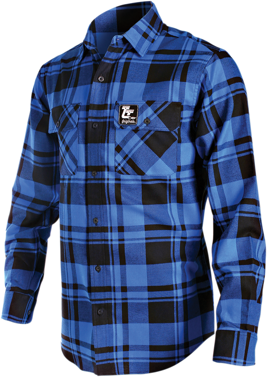 Long-Sleeve Flannel Shirt - Blue/Black - Large Throttle Threads Long-Sleeve Flannel Shirt Button front with two front-button chest pockets Printed graphic on back of shirtRegular price $69.95 -