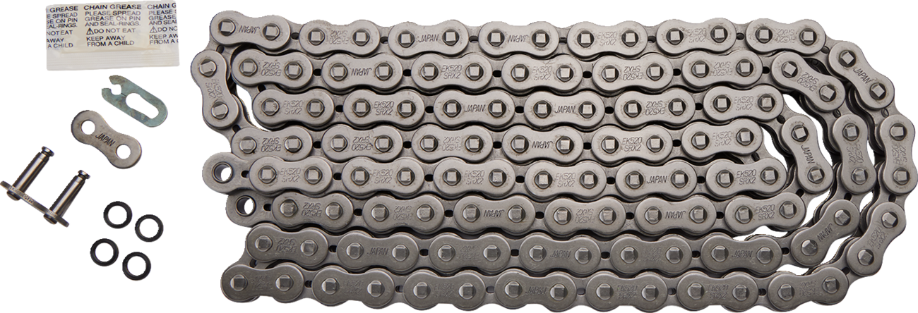 520 SRX2 - Chain - 118 Links 520 SRX2 Chain Special Instructions: INCL CLIP TYPE M/L ONLY ?02JBC INCL CLIP TYPE M/L ONLY €—?02JBC For competition and OEM replacement Features lightening holes, reduced friction and Quadra X-Ring design, which increases chain life from 1.5-2 times longer than a standard O-ring chain Comes with clip-type master link