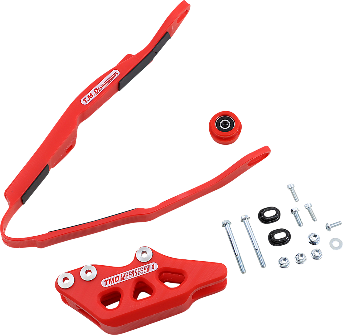 Chain Guide/Slider - Honda - Red Chain Guide and Slider Kit The kit includes dirt cross chain slider, lower powerlip roller or frame pad, and rear chain guide (either factory edition #1 or #2) The dirt cross sliders are made from the TMD compression-injected propriety plastic Most dirt cross sliders have noise-reducing dampening pad installed Fitment: