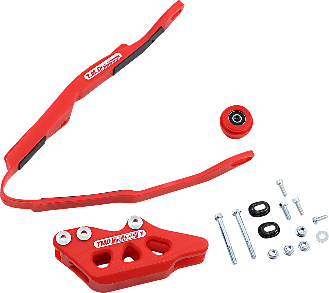 Chain Guide/Slider - Honda - Red Chain Guide and Slider Kit The kit includes dirt cross chain slider, lower powerlip roller or frame pad, and rear chain guide (either factory edition #1 or #2) The dirt cross sliders are made from the TMD compression-injected propriety plastic Most dirt cross sliders have noise-reducing dampening pad installed Fitment: