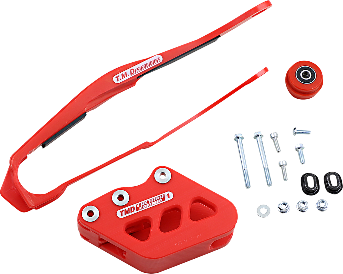 Chain Guide/Slider - Honda - Red Chain Guide and Slider Kit The kit includes dirt cross chain slider, lower powerlip roller or frame pad, and rear chain guide (either factory edition #1 or #2) The dirt cross sliders are made from the TMD compression-injected propriety plastic Most dirt cross sliders have noise-reducing dampening pad installed Fitment: